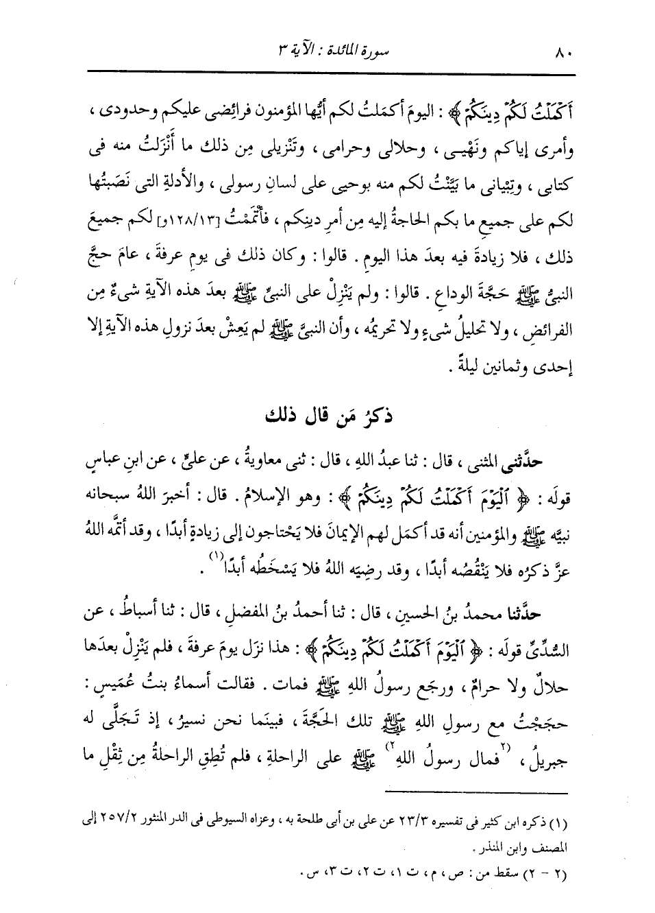 أَكْمَلْتُ لَكُمْ دِينَكُمْ} [المائدة: 3] الْيَوْمَ أَكْمَلْتُ لَكُمْ أَيُّهَا الْمُؤْمِنُونَ فَرَائِضِي عَلَيْكُمْ وَحُدُودِي , وَأَمْرِي إِيَّاكُمْ وَنَهْيِي , وَحَلَالِي وَحَرَامِي , وَتَنْزِيلِي مِنْ ذَلِكَ مَا أَنْزَلْتُ مِنْهُ فِي كِتَابِي , وَتِبْيَانِي مَا بَيَّنْتُ لَكُمْ مِنْهُ بِوَحْيِي عَلَى لِسَانِ رَسُولِي , وَالْأَدِلَّةُ الَّتِي نَصَبْتُهَا لَكُمْ عَلَى جَمِيعِ مَا بِكُمُ الْحَاجَةُ إِلَيْهِ مِنْ أَمْرِ دِينِكُمْ , فَأَتْمَمْتُ لَكُمْ جَمِيعَ ذَلِكَ , فَلَا زِيَادَةَ فِيهِ بَعْدَ هَذَا الْيَوْمِ. قَالُوا: وَكَانَ ذَلِكَ فِي يَوْمِ عَرَفَةَ , عَامَ حَجِّ النَّبِيِّ صَلَّى اللهُ عَلَيْهِ وَسَلَّمَ حَجَّةَ الْوَدَاعِ. وَقَالُوا: لَمْ يَنْزِلْ عَلَى النَّبِيِّ صَلَّى اللهُ عَلَيْهِ وَسَلَّمَ بَعْدَ هَذِهِ الْآيَةِ شَيْءٌ مِنَ الْفَرَائِضِ وَلَا تَحْلِيلُ شَيْءٍ وَلَا تَحْرِيمُهُ , وَإِنَّ النَّبِيَّ صَلَّى اللهُ عَلَيْهِ وَسَلَّمَ لَمْ يَعِشْ بَعْدَ نُزُولِ هَذِهِ الْآيَةِ إِلَّا إِحْدَى وَثَمَانِينَ لَيْلَةً