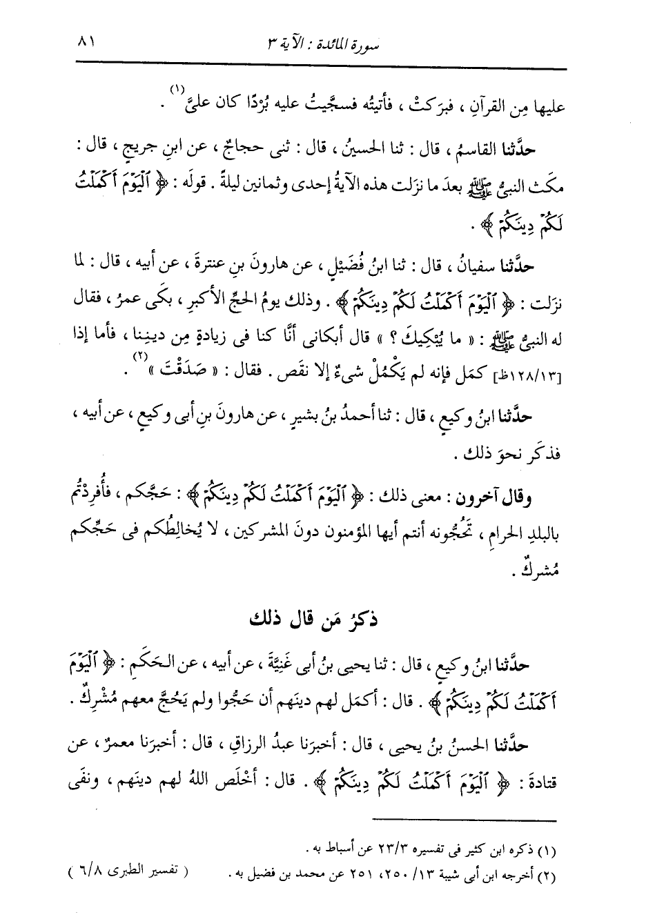 حَدَّثَنَا سُفْيَانُ , قَالَ: ثنا ابْنُ فُضَيْلٍ , عَنْ هَارُونَ بْنِ عَنْتَرَةَ , عَنْ أَبِيهِ , قَالَ: لَمَّا نَزَلَتْ: {§الْيَوْمَ أَكْمَلْتُ لَكُمْ دِينَكُمْ} [المائدة: 3] وَذَلِكَ يَوْمُ الْحَجِّ الْأَكْبَرِ , بَكَى عُمَرُ , فَقَالَ لَهُ النَّبِيُّ صَلَّى اللهُ عَلَيْهِ وَسَلَّمَ: «مَا يُبْكِيكَ؟» قَالَ: أَبْكَانِي أَنَّا كُنَّا فِي زِيَادَةٍ مِنْ دِينِنَا , فَأَمَّا إِذْ كَمُلَ فَإِنَّهُ لَمْ يَكْمُلْ شَيْءٌ إِلَّا نَقَصَ , فَقَالَ: «صَدَقْتَ» حَدَّثَنَا ابْنُ وَكِيعٍ , قَالَ: ثنا أَحْمَدُ بْنُ بَشِيرٍ , عَنْ هَارُونَ بْنِ أَبِي وَكِيعٍ , عَنْ أَبِيهِ , فَذَكَرَ نَحْو ذَلِكَ. وَقَالَ آخَرُونَ: مَعْنَى ذَلِكَ: {الْيَوْمَ أَكْمَلْتُ لَكُمْ دِينَكُمْ} [المائدة: 3] حَجَّكُمْ , فَأُفْرِدْتُمْ بِالْبَلَدِ الْحَرَامِ تَحُجُّونَهُ أَنْتُمْ أَيُّهَا الْمُؤْمِنُونَ دُونَ الْمُشْرِكِينَ لَا يُخَالِطُكُمْ فِي حَجِّكُمْ مُشْرِكٌ