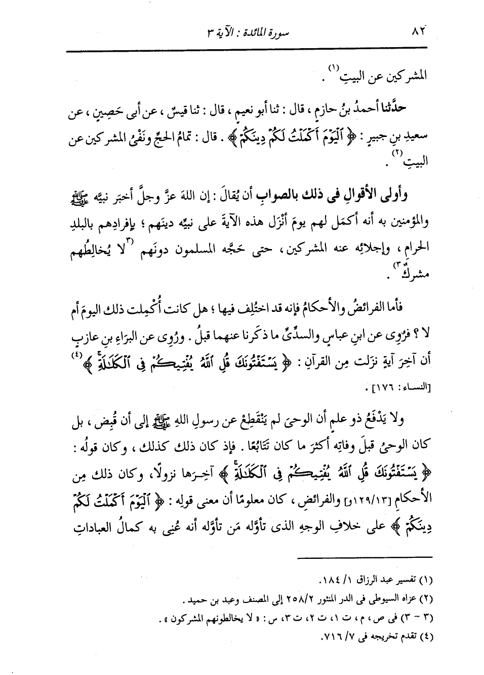 حَدَّثَنَا أَحْمَدُ بْنُ حَازِمٍ , قَالَ: ثنا أَبُو نُعَيْمٍ , قَالَ: ثنا قَيْسٌ , عَنْ أَبِي حُصَيْنٍ , عَنْ سَعِيدِ بْنِ جُبَيْرٍ: {§الْيَوْمَ أَكْمَلْتُ لَكُمْ دِينَكُمْ} [المائدة: 3] قَالَ: «تَمَامُ الْحَجِّ , وَنَفْيِ الْمُشْرِكِينَ عَنِ الْبَيْتِ» وَأَوْلَى الْأَقْوَالِ فِي ذَلِكَ بِالصَّوَابِ أَنْ يُقَالَ: إِنَّ اللَّهَ عَزَّ وَجَلَّ أَخْبَرَ نَبِيَّهُ صَلَّى اللهُ عَلَيْهِ وَسَلَّمَ وَالْمُؤْمِنِينَ بِهِ , أَنَّهُ أَكْمَلَ لَهُمْ يَوْمَ أَنْزَلَ هَذِهِ الْآيَةَ عَلَى نَبِيِّهِ دِينَهُمْ , بِإِفْرَادِهِمْ بِالْبَلَدِ الْحَرَامِ , وَإِجْلَائِهِ عَنْهُ الْمُشْرِكِينَ , حَتَّى حَجَّهُ الْمُسْلِمُونَ دُونَهُمْ , لَا يُخَالِطُونَهُمُ الْمُشْرِكُونَ. فَأَمَّا الْفَرَائِضُ وَالْأَحْكَامُ , فَإِنَّهُ قَدِ اخْتُلِفَ فِيهَا , هَلْ كَانَتْ أُكْمِلَتْ ذَلِكَ الْيَوْمَ أَمْ لَا؟ فَرُوِيَ عَنِ ابْنِ عَبَّاسٍ وَالسُّدِّيِّ مَا ذَكَرْنَا عَنْهُمَا قَبْلُ. وَرُوِيَ عَنِ الْبَرَاءِ بْنِ عَازِبٍ أَنَّ آخِرَ آيَةٍ نَزَلَتْ مِنَ الْقُرْآنِ: {يَسْتَفْتُونَكَ قُلِ اللَّهُ يُفْتِيكُمْ فِي الْكَلَالَةِ} [النساء: 176] وَلَا يَدْفَعُ ذُو عِلْمٍ أَنَّ الْوَحْيَ لَمْ يَنْقَطِعْ عَنْ رَسُولِ اللَّهِ صَلَّى اللهُ عَلَيْهِ وَسَلَّمَ إِلَى أَنْ قُبِضَ , بَلْ كَانَ الْوَحْي قَبْلَ وَفَاتِهِ أَكْثَرَ مَا كَانَ تَتَابُعًا. فَإِذْ كَانَ ذَلِكَ كَذَلِكَ , وَكَانَ قَوْلُهُ: {يَسْتَفْتُونَكَ قُلِ اللَّهُ يُفْتِيكُمْ فِي الْكَلَالَةِ} [النساء: 176] آخِرَهَا نُزُولًا وَكَانَ ذَلِكَ مِنَ الْأَحْكَامِ وَالْفَرَائِضِ , كَانَ مَعْلُومًا أَنَّ مَعْنَى قَوْلِهِ: {الْيَوْمَ أَكْمَلْتُ لَكُمْ دِينَكُمْ} [المائدة: 3] عَلَى خِلَافِ الْوَجْهِ الَّذِي تَأَوَّلَهُ مَنْ تَأَوَّلَهُ , أَعِنِّي: كَمَالَ الْعِبَادَاتِ