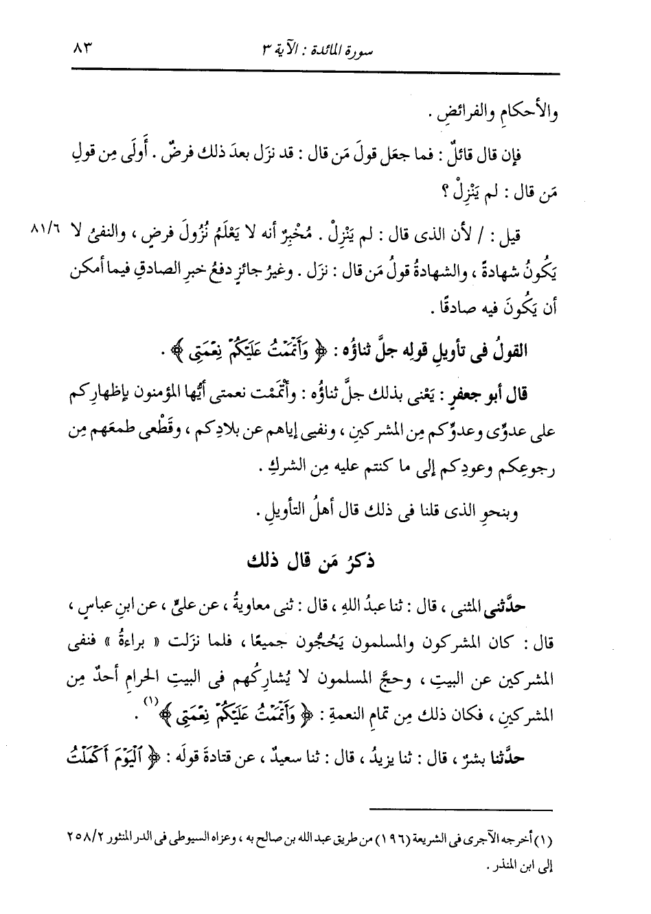 ذِكْرُ مَنْ قَالَ ذَلِكَ: حَدَّثَنِي الْمُثَنَّى قَالَ: ثنا عَبْدُ اللَّهِ , قَالَ: ثني مُعَاوِيَةُ , عَنْ عَلِيٍّ , عَنِ ابْنِ عَبَّاسٍ , قَالَ: " كَانَ الْمُشْرِكُونَ وَالْمُسْلِمُونَ يَحُجُّونَ جَمِيعًا , فَلَمَّا نَزَلَتْ بَرَاءَةُ , فَنَفَى الْمُشْرِكِينَ عَنِ الْبَيْتِ , وَحَجَّ الْمُسْلِمُونَ لَا يُشَارِكُهُمْ فِي الْبَيْتِ الْحَرَامِ أَحَدٌ مِنَ الْمُشْرِكِينَ , فَكَأَنَّ ذَلِكَ مِنْ تَمَامِ النِّعْمَةِ: {§وَأَتْمَمْتُ عَلَيْكُمْ نِعْمَتِي} [المائدة: 3] "