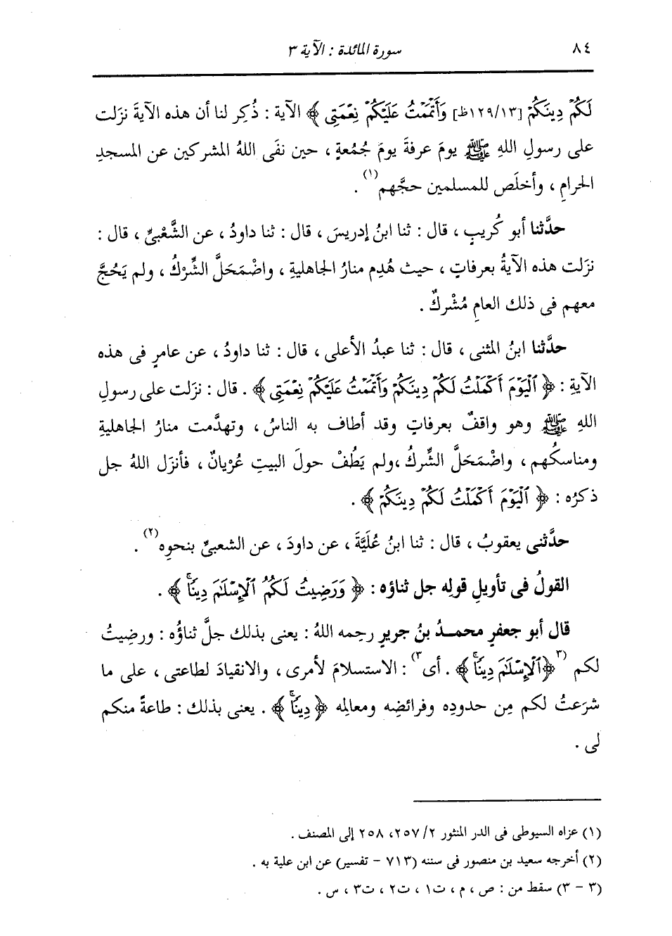 حَدَّثَنَا ابْنُ الْمُثَنَّى قَالَ: ثنا عَبْدُ الْأَعْلَى , قَالَ: ثنا دَاوُدُ , عَنْ عَامِرٍ فِي هَذِهِ الْآيَةِ: {§الْيَوْمَ أَكْمَلْتُ لَكُمْ دِينَكُمْ وَأَتْمَمْتُ عَلَيْكُمْ نِعْمَتِي} [المائدة: 3] قَالَ: " نَزَلَتْ عَلَى رَسُولِ اللَّهِ صَلَّى اللهُ عَلَيْهِ وَسَلَّمَ وَهُوَ وَاقِفٌ بِعَرَفَاتٍ , وَقَدْ أَطَافَ بِهِ النَّاسُ , وَتَهَدَّمَتْ مَنَارُ الْجَاهِلِيَّةِ وَمَنَاسِكُهُمْ , وَاضْمَحَلَّ الشِّرْكُ , وَلَمْ يَطُفْ حَوْلَ الْبَيْتِ عُرْيَانٌ , فَأَنْزَلَ اللَّهُ: {الْيَوْمَ أَكْمَلْتُ لَكُمْ دِينَكُمْ} [المائدة: 3] " حَدَّثَنِي يَعْقُوبُ , قَالَ: ثنا ابْنُ عُلَيَّةَ , عَنْ دَاوُدَ , عَنِ الشَّعْبِيِّ , بِنَحْوِهِ