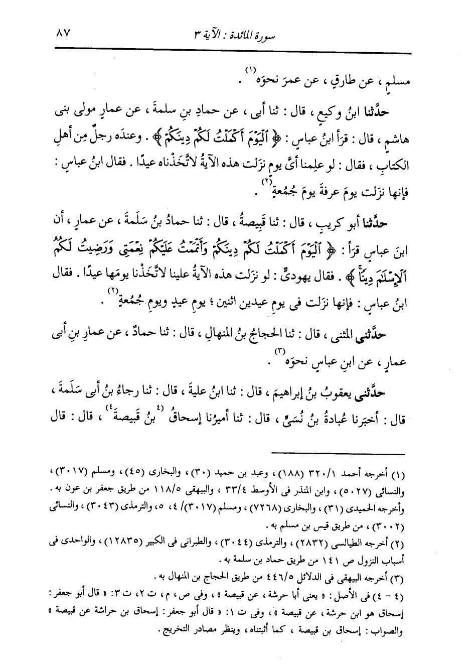 حَدَّثَنَا أَبُو كُرَيْبٍ , قَالَ: ثنا قَبِيصَةُ , قَالَ: ثنا حَمَّادُ بْنُ سَلَمَةَ , عَنْ عَمَّارٍ: أَنَّ ابْنَ عَبَّاسٍ قَرَأَ: {§الْيَوْمَ أَكْمَلْتُ لَكُمْ دِينَكُمْ وَأَتْمَمْتُ عَلَيْكُمْ نِعْمَتِي وَرَضِيتُ لَكُمُ الْإِسْلَامَ دِينًا} [المائدة: 3] فَقَالَ يَهُودِيُّ: لَوْ نَزَلَتْ هَذِهِ الْآيَةُ عَلَيْنَا لَاتَّخَذْنَا يَوْمَهَا عِيدًا , فَقَالَ ابْنُ عَبَّاسٍ: فَإِنَّهَا نَزَلَتْ فِي يَوْمِ عِيدَيْنِ اثْنَيْنِ: يَوْمَ عِيدٍ , وَيَوْمَ جُمُعَةٍ " حَدَّثَنِي الْمُثَنَّى: ثنا الْحَجَّاجُ بْنُ الْمِنْهَالِ , قَالَ: ثنا حَمَّادٌ , عَنْ عَمَّارِ بْنِ أَبِي عَمَّارٍ , عَنِ ابْنِ عَبَّاسٍ نَحْوَهُ