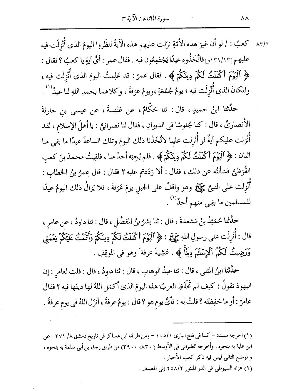 حَدَّثَنَا ابْنُ حُمَيْدٍ , قَالَ: ثنا حَكَّامٌ , عَنْ عَنبَسَةَ , عَنْ عِيسَى بْنِ جَارِيَةَ الْأَنْصَارِيِّ , قَالَ: كُنَّا جُلُوسًا فِي الدِّيوَانِ , فَقَالَ لَنَا نَصْرَانِيٌّ: يَا أَهْلَ الْإِسْلَامِ: لَقَدْ نَزَلَتْ عَلَيْكُمْ آيَةٌ لَوْ نَزَلَتْ عَلَيْنَا لَاتَّخَذْنَا ذَلِكَ الْيَوْمَ وَتِلْكَ السَّاعَةَ عِيدًا مَا بَقِيَ مِنَّا اثْنَانِ: {§الْيَوْمَ أَكْمَلْتُ لَكُمْ دِينَكُمْ} [المائدة: 3] فَلَمْ يُجِبْهُ أَحَدٌ مِنَّا , فَلَقِيتُ مُحَمَّدَ بْنَ كَعْبٍ الْقُرَظِيَّ , فَسَأَلْتُهُ عَنْ ذَلِكَ , فَقَالَ: أَلَا رَدَدْتُمْ عَلَيْهِ؟ فَقَالَ: قَالَ عُمَرُ بْنُ الْخَطَّابِ: أُنْزِلَتْ عَلَى النَّبِيِّ صَلَّى اللهُ عَلَيْهِ وَسَلَّمَ وَهُوَ وَاقِفٌ عَلَى الْجَبَلِ يَوْمَ عَرَفَةَ , فَلَا يَزَالُ ذَلِكَ الْيَوْمُ عِيدًا لِلْمُسْلِمِينَ مَا بَقِيَ مِنْهُمْ أَحَدٌ "
