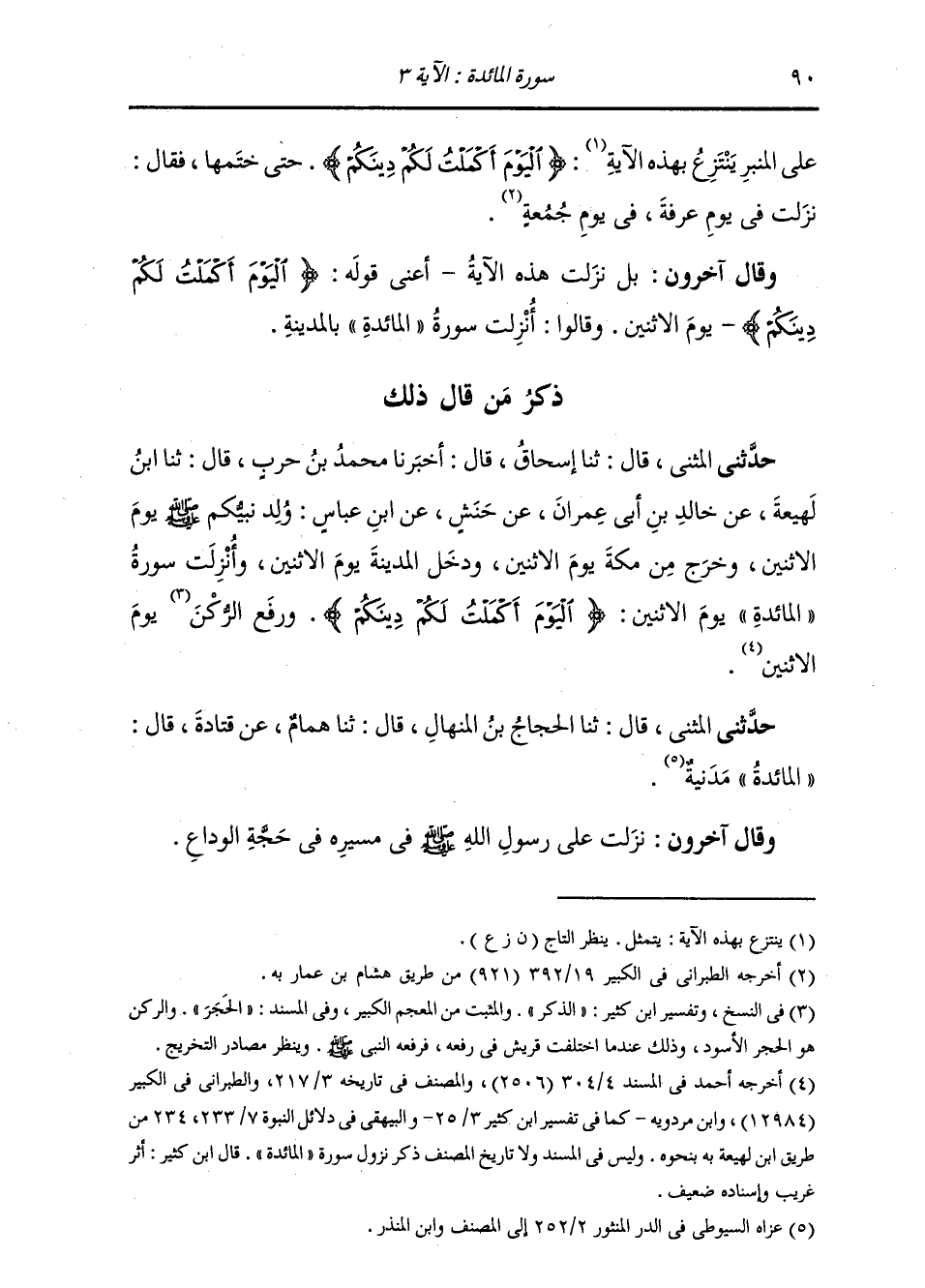 حَدَّثَنِي الْمُثَنَّى , قَالَ: ثنا الْحَجَّاجُ بْنُ الْمِنْهَالِ , قَالَ: ثنا هَمَّامٌ , عَنْ قَتَادَةَ , قَالَ: «§الْمَائِدَةُ مَدَنِيَّةٌ» وَقَالَ آخَرُونَ: نَزَلَتْ عَلَى رَسُولِ اللَّهِ صَلَّى اللهُ عَلَيْهِ وَسَلَّمَ فِي مَسِيرِهِ فِي حَجَّةِ الْوَدَاعِ