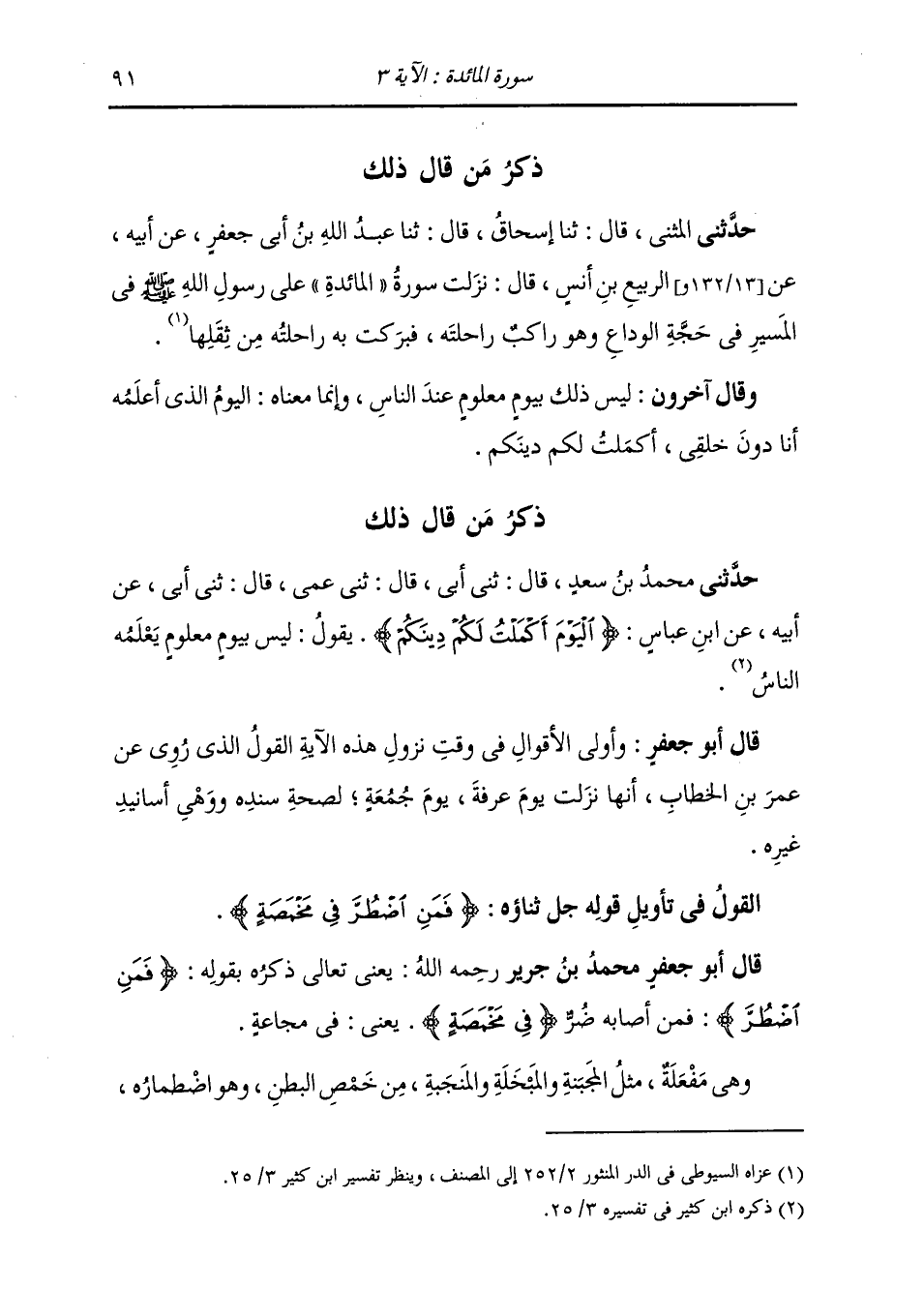 ذِكْرُ مَنْ قَالَ ذَلِكَ: حَدَّثَنِي مُحَمَّدُ بْنُ سَعْدٍ , قَالَ: ثني أَبِي قَالَ: ثني عَمِّي , قَالَ: ثني أَبِي عَنْ أَبِيهِ , عَنِ ابْنِ عَبَّاسٍ: {§الْيَوْمَ أَكْمَلْتُ لَكُمْ دِينَكُمْ} [المائدة: 3] يَقُولُ: «لَيْسَ بِيَوْمٍ مَعْلُومٍ يَعْلَمُهُ النَّاسُ» وَأَوْلَى الْأَقْوَالِ فِي وَقْتِ نُزُولِ الْآيَةِ , الْقَوْلُ الَّذِي رُوِيَ عَنْ عُمَرَ بْنِ الْخَطَّابِ: أَنَّهَا نَزَلَتْ يَوْمَ عَرَفَةَ يَوْمَ جُمُعَةٍ , لِصِحَّةِ سَنَدِهِ وَوَهْيِ أَسَانِيدِ غَيْرِهِ