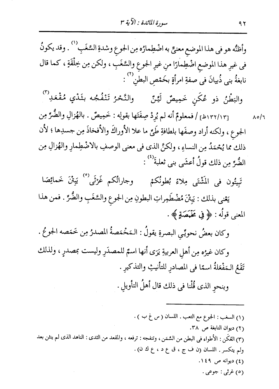 يَعْنِي بِذَلِكَ: يَبِتْنَ مُضْطَمِرَاتِ الْبُطُونِ مِنَ الْجُوعِ وَالسَّغَبِ وَالضَّرِّ , فَمِنْ هَذَا الْمَعْنَى قَوْلُهُ: فِي مَخْمَصَةٍ. وَكَانَ بَعْضُ نَحْوِيِّي الْبَصْرَةِ يَقُولُ: الْمَخْمَصَةُ: الْمَصْدَرُ مِنْ خَمَصَهُ الْجُوعُ. وَكَانَ غَيْرُهُ مِنْ أَهْلِ الْعَرَبِيَّةِ يَرَى أَنَّهَا اسْمٌ لِلْمَصْدَرِ وَلَيْسَتْ بِمَصْدَرٍ؛ وَلِذَلِكَ تَقَعُ الْمَفْعَلَةُ اسْمًا فِي الْمَصَادِرِ لِلتَّأْنِيثِ وَالتَّذْكِيرِ. وَبِنَحْوِ الَّذِي قُلْنَا فِي ذَلِكَ قَالَ أَهْلُ التَّأْوِيلِ