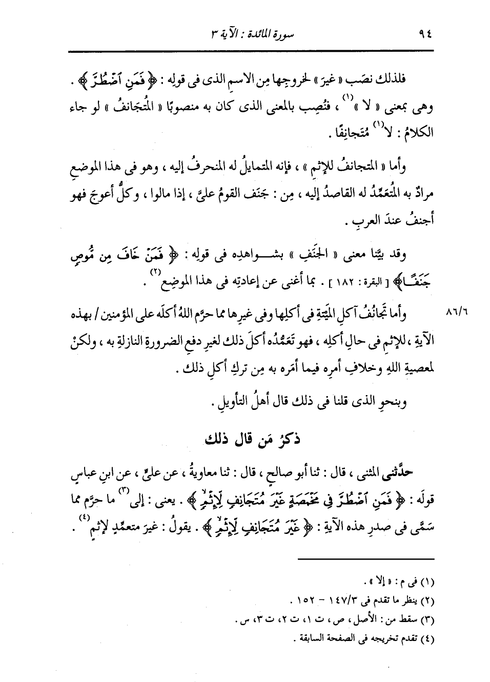 ذِكْرُ مَنْ قَالَ ذَلِكَ: حَدَّثَنِي الْمُثَنَّى , قَالَ: ثنا أَبُو صَالِحٍ , قَالَ: ثني مُعَاوِيَةُ , عَنْ عَلِيٍّ , عَنِ ابْنِ عَبَّاسٍ , قَوْلُهُ: {§فَمَنِ اضْطُرَّ فِي مَخْمَصَةٍ غَيْرَ مُتَجَانِفٍ لِإِثْمٍ} [المائدة: 3] يَعْنِي: إِلَى مَا حَرَّمَ مِمَّا سَمَّى فِي صَدْرِ هَذِهِ الْآيَةِ: {غَيْرَ مُتَجَانِفٍ لِإِثْمٍ} [المائدة: 3] يَقُولُ: «غَيْرَ مُتَعَمِّدٍ لِإِثْمٍ»