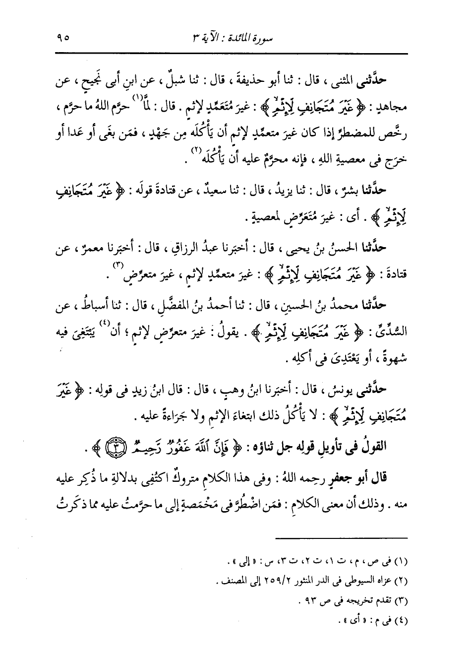 حَدَّثَنَا بِشْرٌ , قَالَ: ثنا يَزِيدُ , قَالَ: ثنا سَعِيدٌ , عَنْ قَتَادَةَ , قَوْلُهُ: {§غَيْرَ مُتَجَانِفٍ لِإِثْمٍ} [المائدة: 3] أَيْ غَيْرُ مُتَعَرِّضٍ لِمَعْصِيَةٍ "
