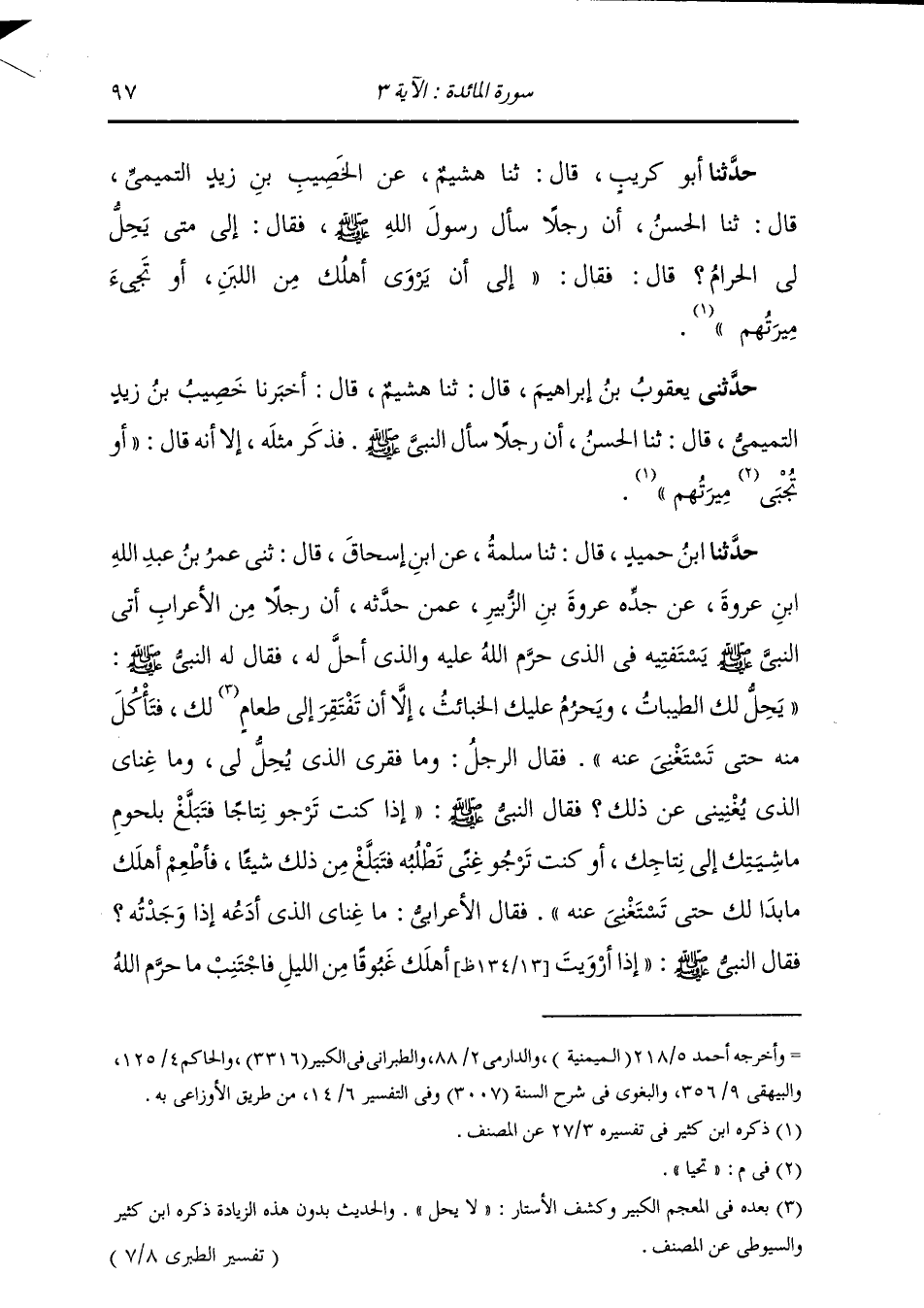 حَدَّثَنَا ابْنُ حُمَيْدٍ , قَالَ: ثنا سَلَمَةُ , عَنِ ابْنِ إِسْحَاقَ , قَالَ: ثني عُمَرُ بْنُ عَبْدِ اللَّهِ بْنِ عُرْوَةَ عَنْ جَدِّهِ , عُرْوَةَ بْنِ الزُّبَيْرِ , عَمَّنْ حَدَّثَهُ: أَنَّ رَجُلًا مِنَ الْأَعْرَابِ أَتَى النَّبِيَّ صَلَّى اللهُ عَلَيْهِ وَسَلَّمَ يَسْتَفْتِيهِ فِي الَّذِي حَرَّمَ اللَّهُ عَلَيْهِ وَالَّذِي أَحَلَّ لَهُ , فَقَالَ لَهُ النَّبِيُّ صَلَّى اللهُ عَلَيْهِ وَسَلَّمَ: «يَحِلُّ لَكَ الطَّيِّبَاتُ , وَيَحْرُمُ عَلَيْكَ الْخَبَائِثُ , إِلَّا أَنْ تَفْتَقِرَ إِلَى طَعَامٍ لَكَ فَتَأْكُلَ مِنْهُ حَتَّى تَسْتَغْنِيَ عَنْهُ» فَقَالَ الرَّجُلُ: وَمَا فَقْرِي الَّذِي يَحِلُّ لِي , وَمَا غِنَايَ الَّذِي يُغْنِينِي عَنْ ذَلِكَ؟ فَقَالَ النَّبِيُّ صَلَّى اللهُ عَلَيْهِ وَسَلَّمَ: «إِذَا كُنْتَ تَرْجُو نَتَاجًا فَتَبَلَّغْ بِلُحُومِ مَاشِيَتِكَ إِلَى نَتَاجِكَ , أَوْ كُنْتَ تَرْجُو غِنًى تَطْلُبُهُ فَتَبَلَّغْ مِنْ ذَلِكَ شَيْئًا , فَأَطْعِمْ أَهْلَكَ مَا بَدَا لَكَ حَتَّى تَسْتَغْنِيَ عَنْهُ» فَقَالَ الْأَعْرَابِيُّ: مَا غِنَايَ الَّذِي أَدَعُهُ إِذَا وَجَدْتُهُ؟ فَقَالَ النَّبِيُّ صَلَّى اللهُ عَلَيْهِ وَسَلَّمَ: «§إِذَا أَرْوَيْتَ أَهْلَكَ غَبُوقًا مِنَ اللَّيْلِ فَاجْتَنِبْ مَا حَرَّمَ اللَّهُ