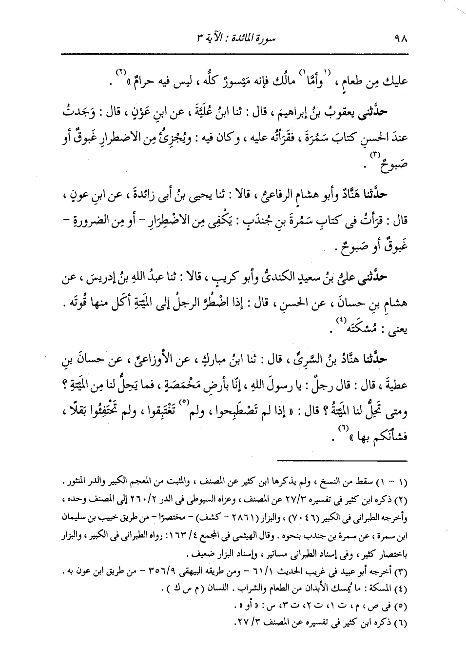 حَدَّثَنِي يَعْقُوبُ بْنُ إِبْرَاهِيمَ , قَالَ: ثنا ابْنُ عُلَيَّةَ , عَنِ ابْنِ عَوْنٍ , قَالَ: وَجَدْتُ عِنْدَ الْحَسَنِ كِتَابَ سَمُرَةَ , فَقَرَأَتْهُ عَلَيْهِ , وَكَانَ فِيهِ: «§وَيُجْزِي مِنَ الِاضْطِرَارِ غَبُوقٌ أَوْ صَبُوحٌ»