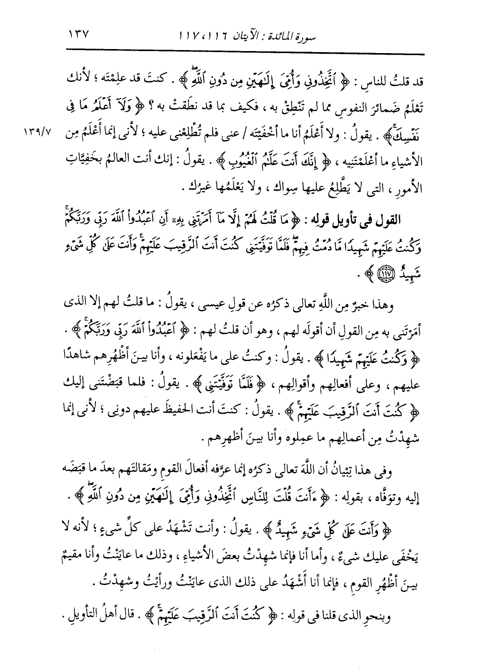 §الْقَوْلُ فِي تَأْوِيلِ قَوْلِهِ تَعَالَى: مَا قُلْتُ لَهُمْ إِلَّا مَا أَمَرْتَنِي بِهِ أَنِ اعْبُدُوا اللَّهَ رَبِّي وَرَبَّكُمْ وَكُنْتُ عَلَيْهِمْ شَهِيدًا مَا دُمْتُ فِيهِمْ فَلَمَّا تَوَفَّيْتَنِي كُنْتَ أَنْتَ الرَّقِيبَ عَلَيْهِمْ وَأَنْتَ عَلَى كُلِّ شَيْءٍ شَهِيدٌ وَهَذَا خَبَرٌ مِنَ اللَّهِ تَعَالَى ذِكْرُهُ عَنْ قَوْلِ عِيسَى يَقُولُ: مَا قُلْتُ لَهُمْ إِلَّا الَّذِي أَمَرْتَنِي بِهِ مِنَ الْقَوْلِ أَنْ أَقُولَهُ لَهُمْ، وَهُوَ أَنْ قُلْتُ لَهُمُ: اعْبُدُوا اللَّهَ رَبِّي وَرَبَّكُمْ وَكُنْتُ عَلَيْهِمْ شَهِيدًا يَقُولُ: وَكُنْتُ عَلَى مَا يَفْعَلُونَهُ وَأَنَا بَيْنَ أَظْهُرِهِمْ شَاهِدًا عَلَيْهِمْ وَعَلَى أَفْعَالِهِمْ وَأَقْوَالِهِمْ. فَلَمَّا تَوَفَّيْتَنِي يَقُولُ: فَلَمَّا قَبَضْتَنِي إِلَيْكَ، كُنْتَ أَنْتَ الرَّقِيبَ عَلَيْهِمْ يَقُولُ: كُنْتَ أَنْتَ الْحَفِيظَ عَلَيْهِمْ دُونِي، لِأَنِّي إِنَّمَا شَهِدْتُ مِنْ أَعْمَالِهِمْ مَا عَمِلُوهُ وَأَنَا بَيْنَ أَظْهُرِهِمْ. وَفِي هَذَا تِبْيَانٌ أَنَّ اللَّهَ تَعَالَى إِنَّمَا عَرَّفَهُ أَفْعَالَ الْقَوْمِ وَمَقَالَتَهُمْ بَعْدَمَا قَبَضَهُ إِلَيْهِ وَتَوَفَّاهُ بِقَوْلِهِ: أَأَنْتَ قُلْتَ لِلنَّاسِ اتَّخِذُونِي وَأُمِّيَ إِلَهَيْنِ مِنْ دُونِ اللَّهِ، وَأَنْتَ عَلَى كُلِّ شَيْءٍ شَهِيدٌ يَقُولُ: وَأَنْتَ تَشْهَدُ عَلَى كُلِّ شَيْءٍ، لِأَنَّهُ لَا يَخْفَى عَلَيْكَ شَيْءٌ، وَأَمَّا أَنَا فَإِنَّمَا شَهِدْتُ بَعْضَ الْأَشْيَاءِ، وَذَلِكَ مَا عَايَنْتُ وَأَنَا مُقِيمٌ بَيْنَ أَظْهُرِ الْقَوْمِ، فَإِنَّمَا أَنَا أَشْهَدُ عَلَى ذَلِكَ الَّذِي عَايَنْتُ وَرَأَيْتُ وَشَهِدْتُ. وَبِنَحْوِ الَّذِي قُلْنَا فِي قَوْلِهِ: كُنْتَ أَنْتَ الرَّقِيبَ عَلَيْهِمْ قَالَ أَهْلُ التَّأْوِيلِ