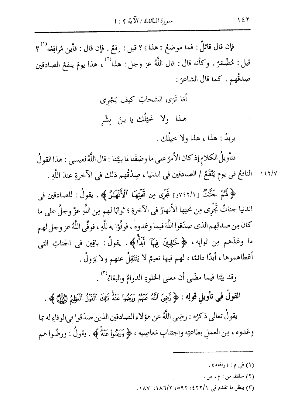 §الْقَوْلُ فِي تَأْوِيلِ قَوْلِهِ تَعَالَى: رَضِيَ اللَّهُ عَنْهُمْ وَرَضُوا عَنْهُ ذَلِكَ الْفَوْزُ الْعَظِيمُ يَقُولُ تَعَالَى ذِكْرُهُ: رَضِيَ اللَّهُ عَنْ هَؤُلَاءِ الصَّادِقِينَ الَّذِينَ صَدَقُوا فِي الْوَفَاءِ لَهُ بِمَا وَعَدُوهُ مِنَ الْعَمَلِ بِطَاعَتِهِ وَاجْتِنَابِ مَعَاصِيهِ، وَرَضُوا عَنْهُ يَقُولُ: وَرَضُوا هُمْ -[143]- عَنِ اللَّهِ تَعَالَى فِي وَفَائِهِ لَهُمْ بِمَا وَعَدَهُمْ عَلَى طَاعَتِهِمْ إِيَّاهُ، فِيمَا أَمَرَهُمْ وَنَهَاهُمْ مِنْ جَزِيلِ ثَوَابِهِ. ذَلِكَ الْفَوْزُ الْعَظِيمُ، يَقُولُ: هَذَا الَّذِي أَعْطَاهُمُ اللَّهُ مِنَ الْجَنَّاتِ الَّتِي تَجْرِي مِنْ تَحْتِهَا الْأَنْهَارُ، خَالِدِينَ فِيهَا، مَرْضِيًّا عَنْهُمْ، وَرَاضِينَ عَنْ رَبِّهِمْ، هُوَ الظُّفُرُ الْعَظِيمُ بِالطِّلْبَةِ وَإِدْرَاكِ الْحَاجَةِ الَّتِي كَانُوا يَطْلُبُونَهَا فِي الدُّنْيَا، وَلَهَا كَانُوا يَعْمَلُونَ فِيهَا، فَنَالُوا مَا طَلَبُوا وَأَدْرَكُوا مَا أَمْلَوْا