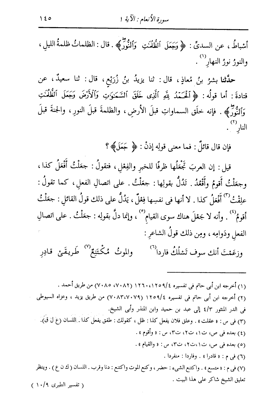 حَدَّثَنَا بِشْرُ بْنُ مُعَاذٍ، قَالَ: ثنا يَزِيدُ بْنُ زُرَيْعٍ، قَالَ: ثنا سَعِيدٌ، عَنْ قَتَادَةَ، أَمَّا قَوْلُهُ: {§الْحَمْدُ لِلَّهِ الَّذِي خَلَقَ السَّمَوَاتِ وَالْأَرْضَ وَجَعَلَ الظُّلُمَاتِ وَالنُّورَ} فَإِنَّهُ خَلَقَ السَّمَوَاتِ قَبْلَ الْأَرْضِ، وَالظُّلْمَةَ قَبْلَ النُّورِ، وَالْجَنَّةَ قَبْلَ النَّارِ " فَإِنْ قَالَ قَائِلٌ: فَمَا مَعْنَى قَوْلِهِ إِذَنْ {جَعَلَ} [الأنعام: 1] ؟ قِيلَ: إِنَّ الْعَرَبَ تَجْعَلُهَا ظَرْفًا لِلْخَبَرِ وَالْفِعْلِ، فَتَقُولُ: جَعَلْتُ أَفْعَلُ كَذَا، وَجَعَلْتُ أَقُومُ وَأَقْعُدُ، تَدُلُّ بِقَوْلِهَا (جَعَلْتُ) عَلَى اتِّصَالِ الْفِعْلِ، كَمَا تَقُولُ: عَلَّقْتُ أَفْعَلُ كَذَا، لَا أَنَّهَا فِي نَفْسِهَا فَعَلَ، يَدُلُّ عَلَى ذَلِكَ قَوْلُ الْقَائِلِ: جَعَلْتُ أَقُومُ، وَأَنَّهُ لَا جَعْلَ هُنَاكَ سِوَى الْقِيَامِ، وَإِنَّمَا دَلَّ بِقَوْلِهِ (جَعَلْتُ) عَلَى اتِّصَالِ الْفِعْلِ وَدَوَامِهِ، وَمَنْ ذَلِكَ قَوْلُ الشَّاعِرِ: