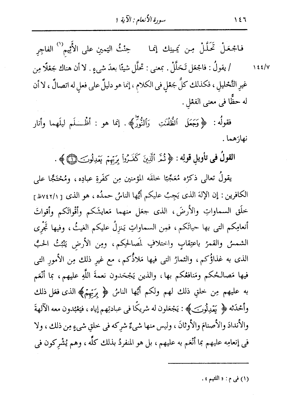 §الْقَوْلُ فِي تَأْوِيلِ قَوْلِهِ تَعَالَى: {ثُمَّ الَّذِينَ كَفَرُوا بِرَبِّهِمْ يَعْدِلُونَ} [الأنعام: 1] يَقُولُ تَعَالَى ذِكْرُهُ مُعَجِّبًا خَلْقَهُ الْمُؤْمِنِينَ مِنْ كَفَرَةِ عِبَادِهِ وَمُحْتَجًّا عَلَى الْكَافِرِينَ: إِنَّ الْإِلَهَ الَّذِي يَجِبُ عَلَيْكُمْ أَيُّهَا النَّاسُ حَمْدَهُ هُوَ الَّذِي خَلَقَ السَّمَوَاتِ وَالْأَرْضَ، الَّذِي جَعَلَ مِنْهُمَا مَعَايشَكُمْ وَأَقْوَاتَكُمْ وَأَقْوَاتَ أَنْعَامِكُمُ الَّتِي بِهَا حَيَاتُكُمْ، فَمِنَ السَّمَوَاتِ يَنْزِلُ عَلَيْكُمُ الْغَيْثُ، وَفِيهَا تَجْرِي الشَّمْسُ وَالْقَمَرُ بِاعْتِقَابٍ وَاخْتِلَافٍ لِمَصَالِحِكُمْ، وَمِنَ الْأَرْضِ يَنْبُتُ الْحَبُّ الَّذِي بِهِ غَذَاؤُكُمْ وَالثِّمَارُ الَّتِي فِيهَا مَلَاذِكُمْ، مَعَ غَيْرِ ذَلِكَ مِنَ الْأُمُورِ الَّتِي فِيهَا مَصَالِحِكُمْ وَمَنَافِعُكُمْ بِهَا. وَالَّذِينَ يَجْحَدُونَ نِعْمَةَ اللَّهِ عَلَيْهِمْ بِمَا أَنْعَمَ بِهِ عَلَيْهِمْ مِنْ خَلْقِ ذَلِكَ لَهُمْ وَلَكُمْ أَيُّهَا النَّاسُ بِرَبِّهِمُ الَّذِي فَعَلَ ذَلِكَ وَأَحْدَثَهُ {يَعْدِلُونَ} [الأنعام: 1] : يَجْعَلُونَ لَهُ شَرِيكًا فِي عِبَادَتِهِمْ إِيَّاهُ، فَيَعْبُدُونَ مَعَهُ الْآلِهَةَ وَالْأَنْدَادَ وَالْأَصْنَامَ وَالْأَوْثَانَ، وَلَيْسَ مِنْهَا شَيْءٌ شَرَكَهُ فِي خَلَقِ شَيْءٍ مِنْ ذَلِكَ وَلَا فِي إِنْعَامِهِ عَلَيْهِمْ بِمَا أَنْعَمَ بِهِ عَلَيْهِمْ، بَلْ هُوَ الْمُنْفَرِدُ بِذَلِكَ كُلِّهِ، وَهُمْ يُشْرِكُونَ فِي