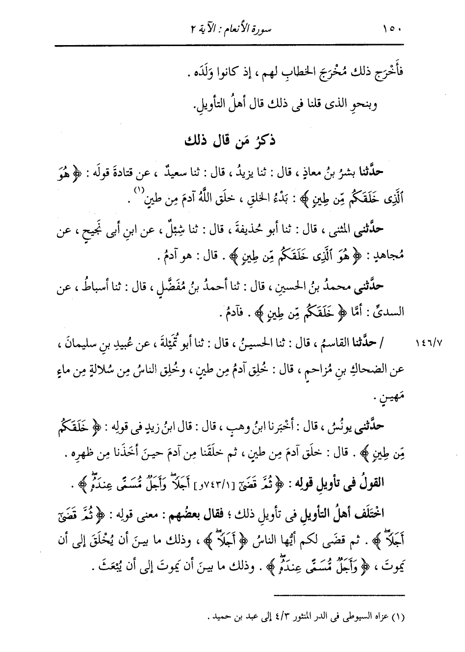 ذِكْرُ مَنْ قَالَ ذَلِكَ حَدَّثَنَا بِشْرُ بْنُ مُعَاذٍ، قَالَ: ثنا يَزِيدُ، قَالَ: ثنا سَعِيدٌ، عَنْ قَتَادَةَ، قَوْلُهُ: {هُوَ الَّذِي خَلَقَكُمْ مِنْ طِينٍ} [الأنعام: 2] : «§بَدْءُ الْخَلْقِ خَلَقَ اللَّهُ آدَمَ مِنْ طِينٍ»