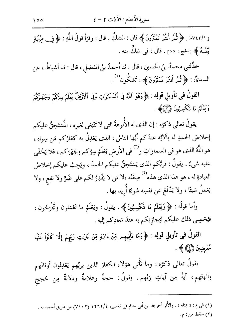 §الْقَوْلُ فِي تَأْوِيلِ قَوْلِهِ تَعَالَى: {وَهُوَ اللَّهُ فِي السَّمَوَاتِ وَفِي الْأَرْضِ يَعْلَمُ سِرَّكُمْ وَجَهْرَكُمْ وَيَعْلَمُ مَا تَكْسِبُونَ} يَقُولُ تَعَالَى ذِكْرُهُ: إِنَّ الَّذِي لَهُ الْأُلُوهَةُ الَّتِي لَا تَنْبَغِي لِغَيْرِهِ، الْمُسْتَحِقُّ عَلَيْكُمْ إِخْلَاصَ الْحَمْدِ لَهُ بِآلَائِهِ عِنْدَكُمْ أَيُّهَا النَّاسُ، الَّذِي يَعْدِلُ بِهِ كُفَّارُكُمْ مَنْ سِوَاهُ، هُوَ اللَّهُ الَّذِي هُوَ فِي السَّمَوَاتِ وَفِي الْأَرْضِ، {يَعْلَمُ سِرَّكُمْ وَجَهْرَكُمْ} [الأنعام: 3] فَلَا يَخْفَى عَلَيْهِ شَيْءٌ، يَقُولُ: فَرَبُّكُمُ الَّذِي يَسْتَحِقُّ عَلَيْكُمُ الْحَمْدَ وَيَجِبُ عَلَيْكُمْ إِخْلَاصُ الْعِبَادَةِ لَهُ، هُوَ هَذَا الَّذِي صِفَتُهُ، لَا مَنْ لَا يَقْدِرُ لَكُمْ عَلَى ضَرٍّ وَلَا نَفْعٍ وَلَا يَعْمَلُ شَيْئًا وَلَا يَدْفَعُ عَنْ نَفْسِهِ سُوءًا أُرِيدَ بِهَا. وَأَمَّا قَوْلُهُ: {وَيَعْلَمُ مَا تَكْسِبُونَ} [الأنعام: 3] يَقُولُ: وَيَعْلَمُ مَا تَعْمَلُونَ وَتَجْرَحُونَ، فَيُحْصِي ذَلِكَ عَلَيْكُمْ لِيُجَازِيكُمْ بِهِ عِنْدَ مَعَادِكُمْ إِلَيْهِ