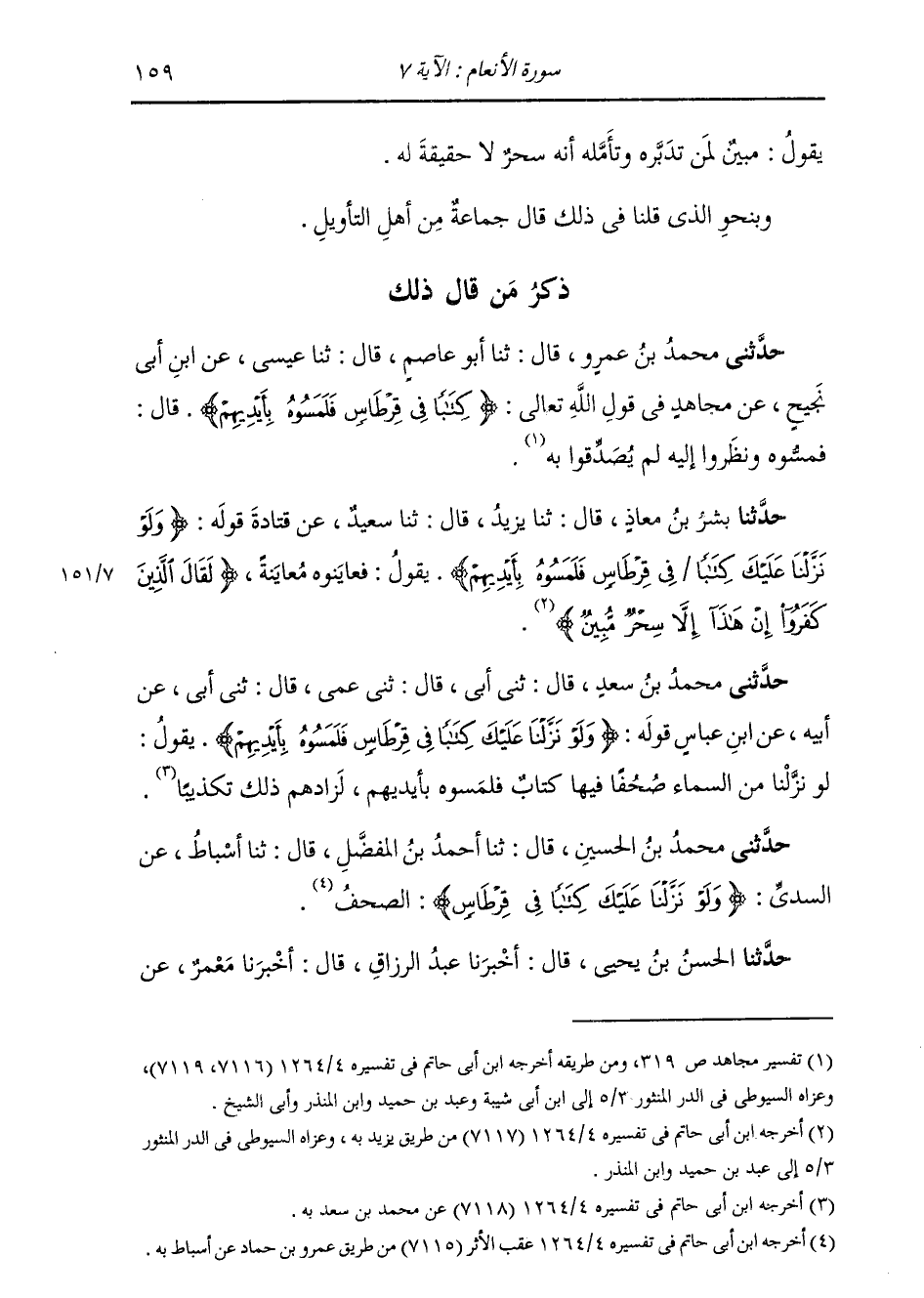 ذِكْرُ مَنْ قَالَ ذَلِكَ حَدَّثَنِي مُحَمَّدُ بْنُ عَمْرٍو، قَالَ: ثنا أَبُو عَاصِمٍ، قَالَ: ثنا عِيسَى، عَنِ ابْنِ أَبِي نَجِيحٍ، عَنْ مُجَاهِدٍ، فِي قَوْلِ اللَّهِ تَعَالَى: {§كِتَابًا فِي قِرْطَاسٍ فَلَمَسُوهُ بِأَيْدِيهِمْ} [الأنعام: 7] قَالَ: «فَمَسُّوهُ وَنَظَرُوا إِلَيْهِ لَمْ يُصَدِّقُوا بِهِ»