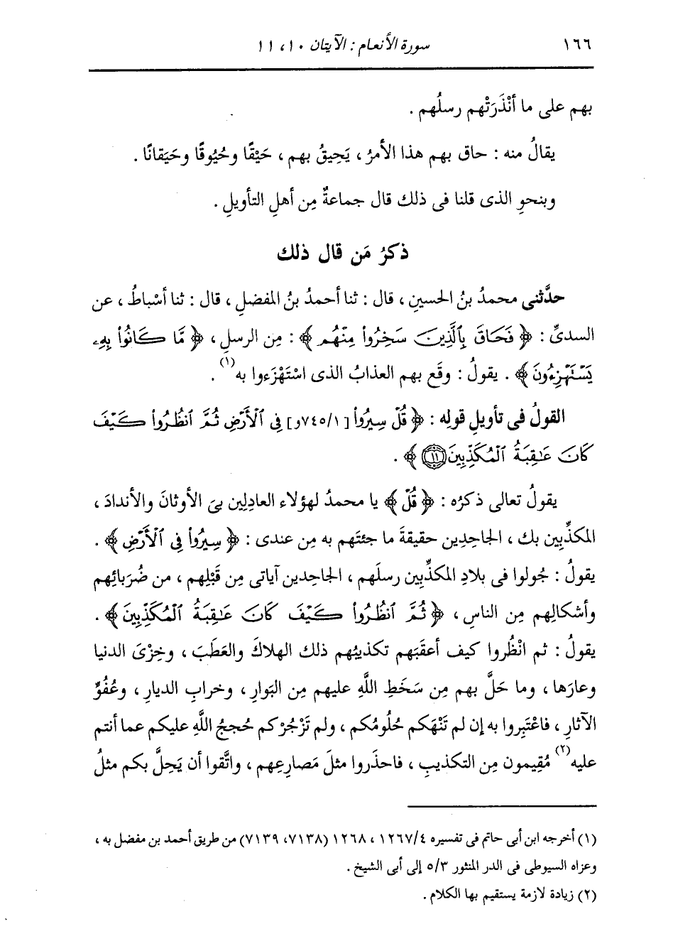 §الْقَوْلُ فِي تَأْوِيلِ قَوْلِهِ تَعَالَى: {قُلْ سِيرُوا فِي الْأَرْضِ ثُمَّ انْظُرُوا كَيْفَ كَانَ عَاقِبَةُ الْمُكَذِّبِينَ} [الأنعام: 11] يَقُولُ تَعَالَى ذِكْرُهُ: قُلْ يَا مُحَمَّدُ لِهَؤُلَاءِ الْعَادِلِينَ بِيَ الْأَوْثَانَ وَالْأَنْدَادَ الْمُكَذِّبِينَ بِكَ الْجَاحِدِينَ حَقِيقَةَ مَا جِئْتَهُمْ بِهِ مِنْ عِنْدِي: {سِيرُوا فِي الْأَرْضِ} [الأنعام: 11] يَقُولُ: جُولُوا فِي بِلَادِ الْمُكَذِّبِينَ رُسُلَهُمُ الْجَاحِدِينَ آيَاتِي مِنْ قَبْلِهِمْ مِنْ ضُرَبَائِهِمْ وَأَشْكَالِهِمْ مِنَ النَّاسِ. {ثُمَّ انْظُرُوا كَيْفَ كَانَ عَاقِبَةُ الْمُكَذِّبِينَ} [الأنعام: 11] ، يَقُولُ: ثُمَّ انْظُرُوا كَيْفَ أَعْقَبَهُمْ تَكْذِيبُهُمْ ذَلِكَ الْهَلَاكَ وَالْعَطَبَ وَخِزْيَ الدُّنْيَا وَعَارَهَا، وَمَا حَلَّ بِهِمْ مِنْ سَخَطِ اللَّهِ عَلَيْهِمْ مِنَ الْبَوَارِ وَخَرَابِ الدِّيَارِ وَعَفْوِ الْآثَارِ. فَاعْتَبِرُوا بِهِ، إِنْ لَمْ تَنْهَكُمْ حُلُومُكُمْ، وَلَمْ تَزْجُرْكُمْ حُجَجُ اللَّهِ عَلَيْكُمْ، عَمَّا أَنْتُمْ مُقِيمُونَ عَلَيْهِ مِنَ التَّكْذِيبِ، فَاحْذَرُوا مِثْلَ مَصَارِعِهِمْ، وَاتَّقُوا أَنْ يَحِلَّ بِكُمْ مِثْلُ