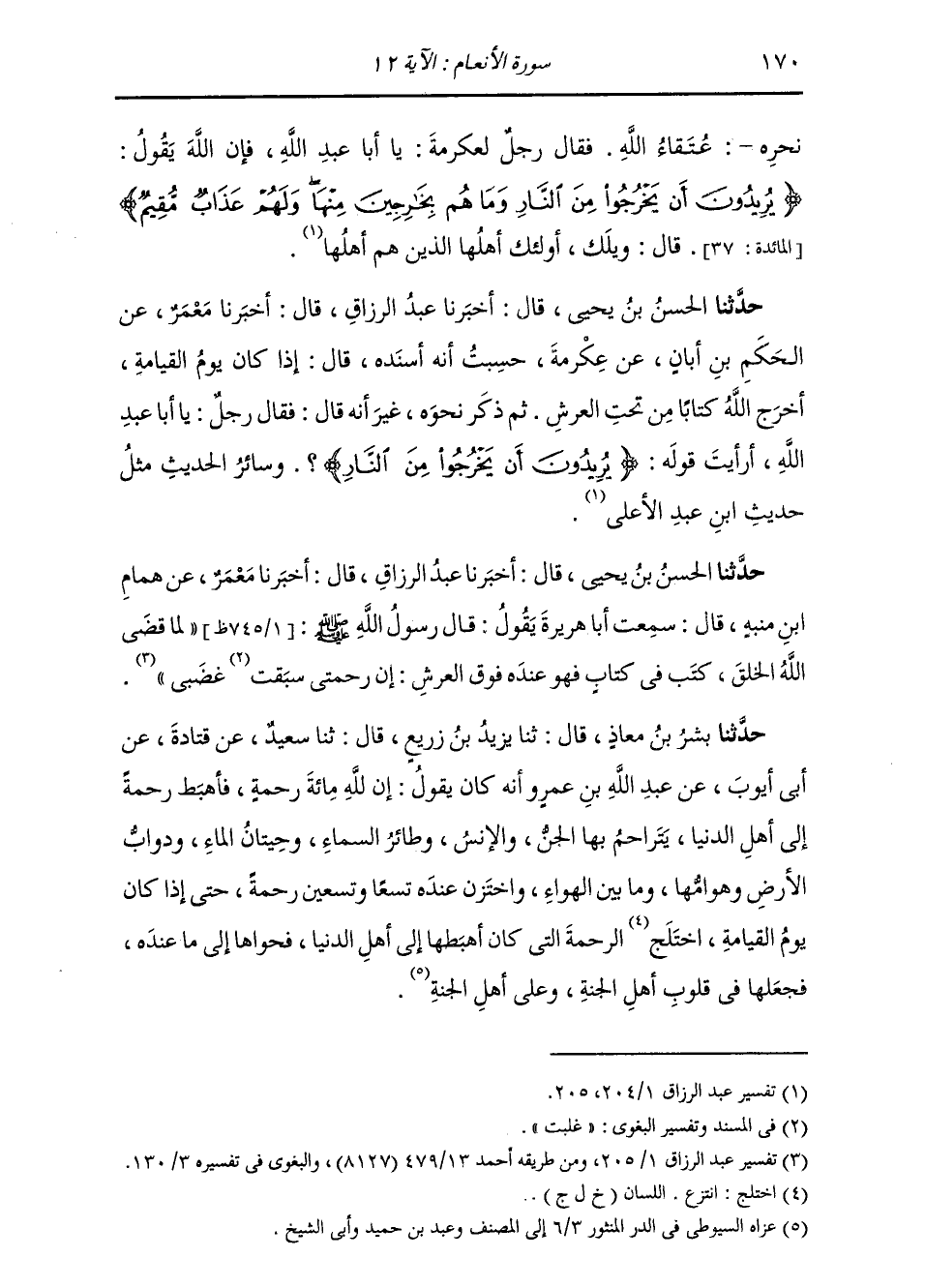 حَدَّثَنَا بِشْرُ بْنُ مُعَاذٍ، قَالَ: ثنا يَزِيدُ بْنُ زُرَيْعٍ، قَالَ: ثنا سَعِيدٌ، عَنْ قَتَادَةَ، عَنْ أَبِي أَيُّوبَ، عَنْ عَبْدِ اللَّهِ بْنِ عَمْرٍو، أَنَّهُ كَانَ يَقُولُ: «§إِنَّ لِلَّهِ مِائَةَ رَحْمَةٍ، فَأَهْبَطَ رَحْمَةً إِلَى أَهْلِ الدُّنْيَا يَتَرَاحَمُ بِهَا الْجِنُّ وَالْإِنْسُ وَطَائِرُ السَّمَاءِ وَحِيتَانُ الْمَاءِ وَدَوَابُّ الْأَرْضِ وَهَوَامُّهَا وَمَا بَيْنَ الْهَوَاءِ، وَاخْتَزَنَ عِنْدَهُ تِسْعًا وَتِسْعِينَ رَحْمَةً، حَتَّى إِذَا كَانَ يَوْمَ الْقِيَامَةِ اخْتَلَجَ الرَّحْمَةَ الَّتِي كَانَ أَهْبَطَهَا إِلَى أَهْلِ الدُّنْيَا، فَحَوَاهَا إِلَى مَا عِنْدَهُ، فَجَعَلَهَا فِي قُلُوبِ أَهْلِ الْجَنَّةِ وَعَلَى أَهْلِ الْجَنَّةِ»