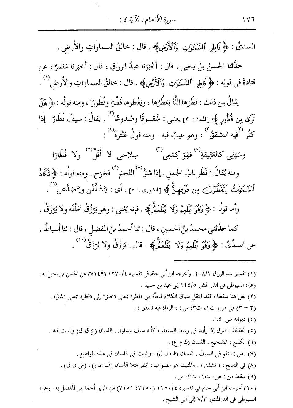 حَدَّثَنَا الْحَسَنُ بْنُ يَحْيَى، قَالَ: أَخْبَرَنَا عَبْدُ الرَّزَّاقِ، قَالَ: أَخْبَرَنَا مَعْمَرٌ، عَنْ قَتَادَةَ، فِي قَوْلِهِ: {فَاطِرِ السَّمَوَاتِ وَالْأَرْضِ} قَالَ: «§خَالِقِ السَّمَوَاتِ وَالْأَرْضِ» يُقَالُ مِنْ ذَلِكَ: فَطَرَهَا اللَّهُ يَفْطُرُهَا وَيَفْطِرُهَا فَطْرًا وَفُطُورًا، وَمِنْهُ قَوْلُهُ: {هَلْ تَرَى مِنْ فُطُورٍ} [الملك: 3] يَعْنِي: شُقُوقًا وَصُدُوعًا، يُقَالُ: سَيْفٌ فُطَارٌ: إِذَا كَثُرَ فِيهِ التَّشَقُّقُ، وَهُوَ عَيْبٌ فِيهِ، وَمِنْهُ قَوْلُ عَنْتَرَةَ: