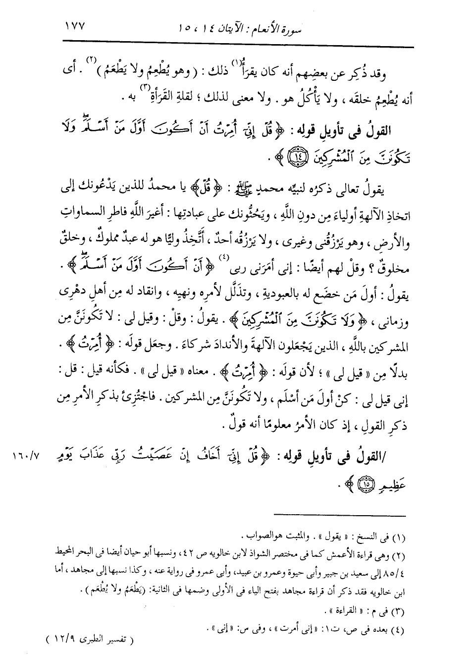§الْقَوْلُ فِي تَأْوِيلِ قَوْلِهِ تَعَالَى: {قُلْ إِنِّي أُمِرْتُ أَنْ أَكُونَ أَوَّلَ مَنْ أَسْلَمَ وَلَا تَكُونَنَّ مِنَ الْمُشْرِكِينَ} [الأنعام: 14] يَقُولُ تَعَالَى ذِكْرُهُ لِنَبِيِّهِ مُحَمَّدٍ صَلَّى اللهُ عَلَيْهِ وَسَلَّمَ: قُلْ يَا مُحَمَّدُ لِلَّذِينَ يَدْعُونَكَ إِلَى اتِّخَاذِ الْآلِهَةِ أَوْلِيَاءَ مِنْ دُونِ اللَّهِ وَيَحُثُّونَكَ عَلَى عِبَادَتِهَا: أَغَيْرَ اللَّهِ فَاطِرِ السَّمَوَاتِ وَالْأَرْضِ، وَهُوَ يَرْزُقُنِي وَغَيْرِي، وَلَا يَرْزُقُهُ أَحَدٌ، أَتَّخِذُ وَلِيًّا هُوَ لَهُ عَبْدٌ مَمْلُوكٌ وَخَلْقٌ مَخْلُوقٌ؟ وَقُلْ لَهُمْ أَيْضًا: إِنِّي أَمَرَنِي رَبِّي أَنْ أَكُونَ أَوَّلَ مَنْ أَسْلَمَ، يَقُولُ: أَوَّلُ مَنْ خَضَعَ لَهُ بِالْعُبُودِيَّةِ وَتَذَلَّلَ لَأَمْرِهِ وَنَهْيِهِ وَانْقَادَ لَهُ مِنْ أَهْلِ دَهْرِي وَزَمَانِي. {وَلَا تَكُونَنَّ مِنَ الْمُشْرِكِينَ} [الأنعام: 14] يَقُولُ: وَقُلْ: وَقِيلَ لِي لَا تَكُونَنَّ مِنَ الْمُشْرِكِينَ بِاللَّهِ الَّذِينَ يَجْعَلُونَ الْآلِهَةَ وَالْأَنْدَادَ شُرَكَاءَ وَجَعَلَ قَوْلَهُ: {أُمِرْتُ} [الأنعام: 14] بَدَلًا مِنْ (قِيلَ لِي) ، لِأَنَّ قَوْلَهُ: {أُمِرْتُ} [الأنعام: 14] مَعْنَاهُ: قِيلَ لِي، فَكَأَنَّهُ قِيلَ: قُلْ إِنِّي قِيلَ لِي: كُنْ أَوَّلَ مَنْ أَسْلَمَ، وَلَا تَكُونَنَّ مِنَ الْمُشْرِكِينَ، فَاجْتُزِئَ بِذِكْرِ الْأَمْرِ مِنْ ذِكْرِ الْقَوْلِ، إِذْ كَانَ الْأَمْرُ مَعْلُومًا أَنَّهُ قَوْلٌ.