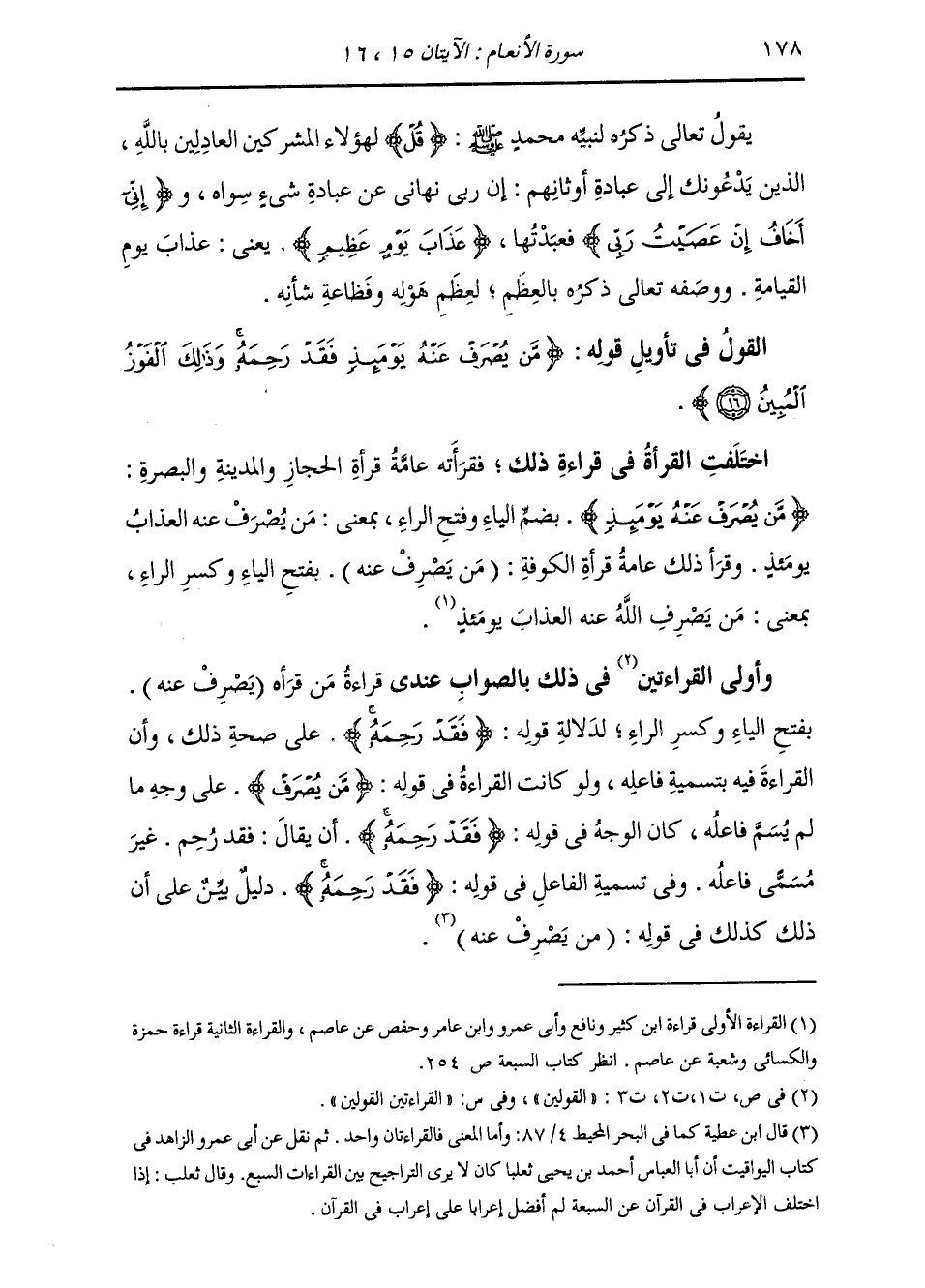 §الْقَوْلُ فِي تَأْوِيلِ قَوْلِهِ تَعَالَى: {مَنْ يُصْرَفْ عَنْهُ يَوْمَئِذٍ فَقَدْ رَحِمَهُ وَذَلِكَ الْفَوْزُ الْمُبِينُ} [الأنعام: 16] اخْتَلَفَ الْقُرَّاءُ فِي قِرَاءَةِ ذَلِكَ، فَقَرَأَتْهُ عَامَّةُ قُرَّاءِ الْحِجَازِ وَالْمَدِينَةِ وَالْبَصْرَةِ: {مَنْ يُصْرَفْ عَنْهُ يَوْمَئِذٍ} [الأنعام: 16] بِضَمِّ الْيَاءِ وَفَتْحِ الرَّاءِ، بِمَعْنَى: مَنْ يُصْرَفْ عَنْهُ الْعَذَابُ يَوْمَئِذٍ. وَقَرَأَ ذَلِكَ عَامَّةُ قُرَّاءِ الْكُوفَةِ: (مَنْ يَصْرِفْ عَنْهُ) بِفَتْحِ الْيَاءِ وَكَسْرِ الرَّاءِ، بِمَعْنَى: مَنْ يَصْرِفِ اللَّهُ عَنْهُ الْعَذَابَ يَوْمَئِذٍ. وَأَوْلَى الْقِرَاءَتَيْنِ فِي ذَلِكَ بِالصَّوَابِ عِنْدِي، قِرَاءَةُ مَنْ قَرَأَهُ: (يَصْرِفْ عَنْهُ) بِفَتْحِ الْيَاءِ وَكَسْرِ الرَّاءِ، لِدَلَالَةِ قَوْلِهِ: {فَقَدْ رَحِمَهُ} [الأنعام: 16] عَلَى صِحَّةِ ذَلِكَ، وَأَنَّ الْقِرَاءَةَ فِيهِ بِتَسْمِيَةِ فَاعِلِهِ. وَلَوْ كَانَتِ الْقِرَاءَةُ فِي قَوْلِهِ: {مَنْ يُصْرَفْ} [الأنعام: 16] عَلَى وَجْهِ مَا لَمْ يُسَمَّ فَاعِلُهُ، كَانَ الْوَجْهُ فِي قَوْلِهِ: {فَقَدْ رَحِمَهُ} [الأنعام: 16] أَنْ يُقَالَ: (فَقَدْ رُحِمَ) غَيْرُ مُسَمًّى فَاعِلُهُ، وَفِي تَسْمِيَةِ الْفَاعِلِ فِي قَوْلِهِ: {فَقَدْ رَحِمَهُ} [الأنعام: 16] دَلِيلٌ بَيِّنٌ عَلَى أَنَّ ذَلِكَ كَذَلِكَ فِي قَوْلِهِ: (مَنْ يَصْرِفُ عَنْهُ) .