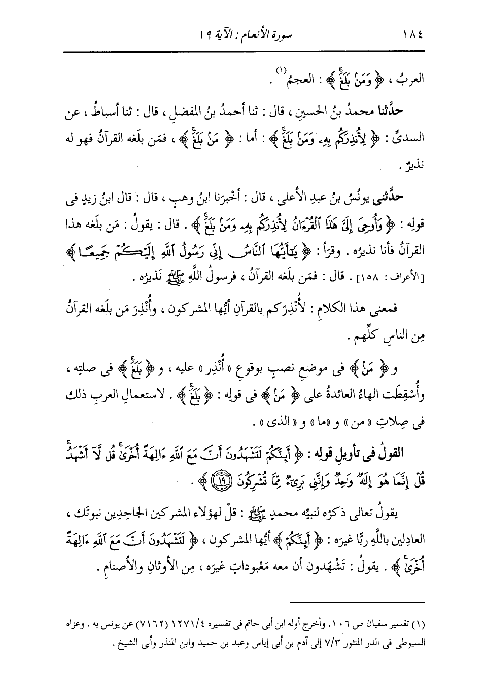 حَدَّثَنَا مُحَمَّدُ بْنُ الْحُسَيْنِ، قَالَ: ثنا أَحْمَدُ بْنُ الْمُفَضَّلِ، قَالَ: ثنا أَسْبَاطٌ، عَنِ السُّدِّيِّ: {§لِأُنْذِرَكُمْ بِهِ وَمَنْ بَلَغَ} [الأنعام: 19] : أَمَّا {مَنْ بَلَغَ} [الأنعام: 19] : فَمَنْ بَلَغَهُ الْقُرْآنُ فَهُوَ لَهُ نَذِيرُُ "