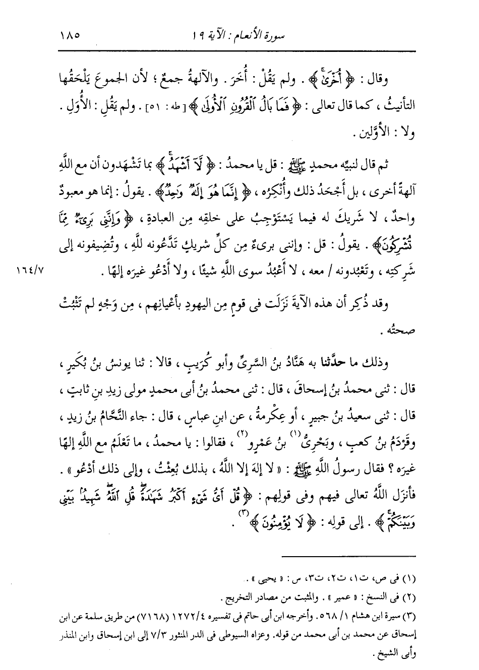 وَذَلِكَ مَا حَدَّثَنَا بِهِ هَنَّادُ بْنُ السَّرِيِّ وَأَبُو كُرَيْبٍ، قَالَا: ثنا يُونُسُ بْنُ بُكَيْرٍ، قَالَ: ثني مُحَمَّدُ بْنُ إِسْحَاقَ، قَالَ: ثني مُحَمَّدُ بْنُ أَبِي مُحَمَّدٍ مَوْلَى زَيْدِ بْنِ ثَابِتٍ قَالَ: ثني سَعِيدُ بْنُ جُبَيْرٍ، أَوْ عِكْرِمَةُ، عَنِ ابْنِ عَبَّاسٍ، قَالَ: جَاءَ النَّحَّامُ بْنُ زَيْدٍ وَقَرْدَمُ بْنُ كَعْبٍ وَبَحْرِيُّ بْنُ عُمَيْرٍ، فَقَالُوا: يَا مُحَمَّدُ، أَمَا تَعْلَمُ مَعَ اللَّهِ إِلَهًا غَيْرَهُ؟ فَقَالَ رَسُولُ اللَّهِ صَلَّى اللهُ عَلَيْهِ وَسَلَّمَ: «§لَا إِلَهَ إِلَّا اللَّهُ، بِذَلِكَ بُعِثْتُ، وَإِلَى ذَلِكَ أَدْعُو» ، فَأَنْزَلَ اللَّهُ تَعَالَى فِيهِمْ وَفِي قَوْلِهِمْ: {قُلْ أَيُّ شَيْءٍ أَكْبَرُ شَهَادَةً قُلِ اللَّهُ شَهِيدٌ بَيْنِي وَبَيْنَكُمْ} [الأنعام: 19] إِلَى قَوْلِهِ: {لَا يُؤْمِنُونَ} [الأنعام: 20]