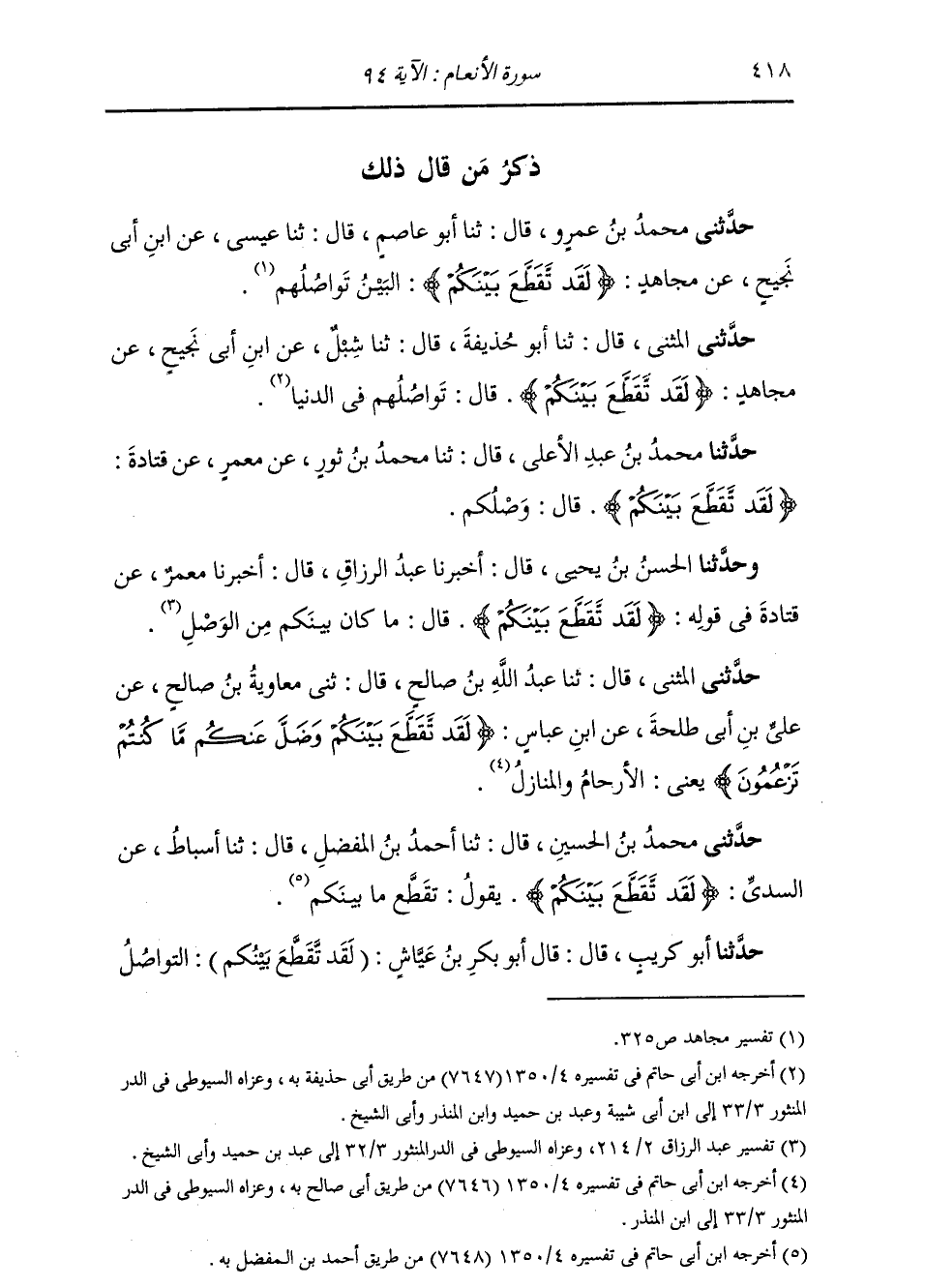 حَدَّثَنِي الْمُثَنَّى قَالَ: ثنا أَبُو حُذَيْفَةَ قَالَ: ثنا شِبْلٌ، عَنِ ابْنِ أَبِي نَجِيحٍ، عَنْ مُجَاهِدٍ: {§لَقَدْ تَقَطَّعَ بَيْنَكُمْ} [الأنعام: 94] قَالَ: «تَوَاصُلُهُمْ فِي الدُّنْيَا»