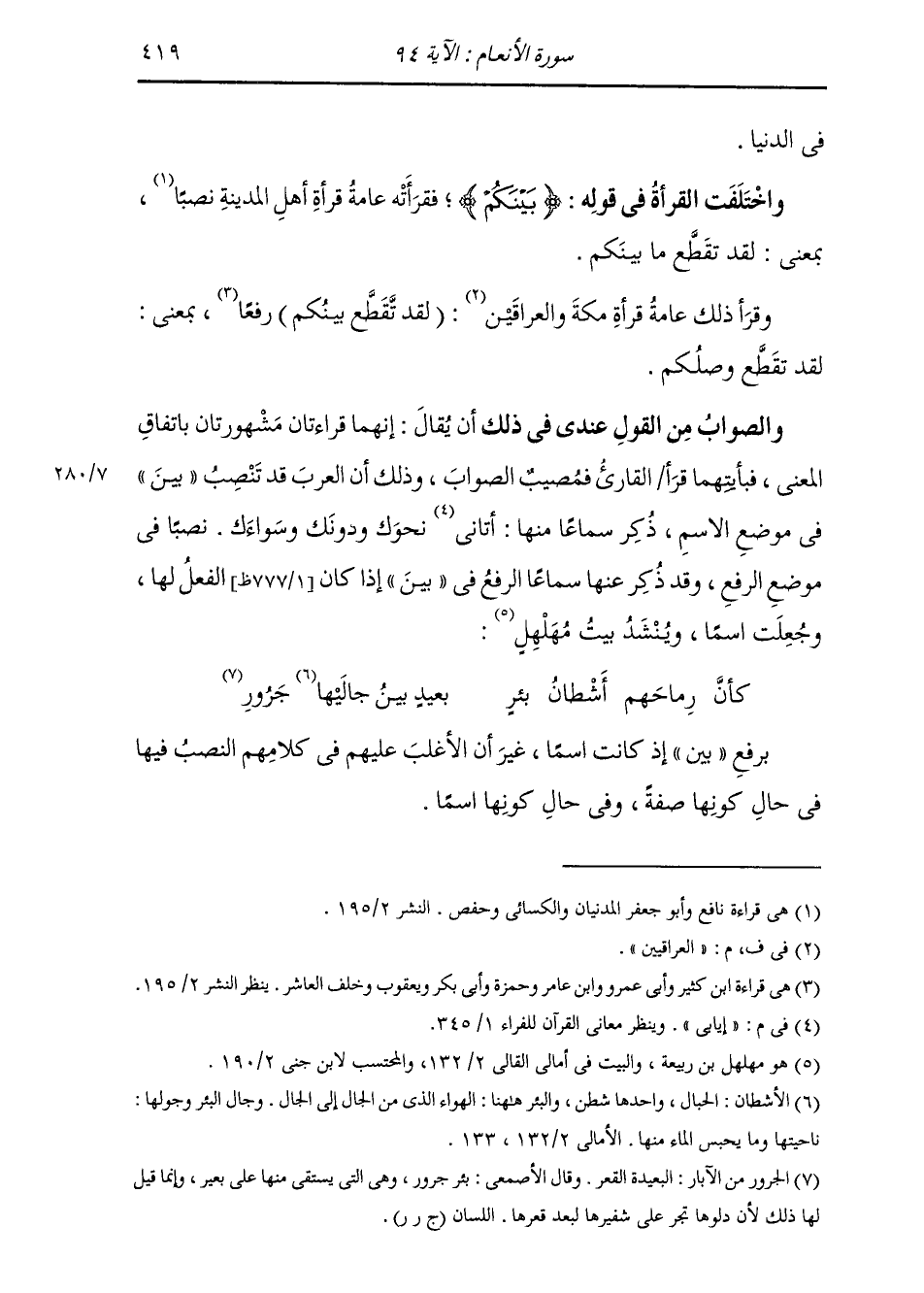 فِي الدُّنْيَا» وَاخْتَلَفَتِ الْقُرَّاءُ فِي قَوْلِهِ: {بَيْنَكُمْ} [الأنعام: 94] ، فَقَرَأَتْهُ عَامَّةُ قُرَّاءِ أَهْلِ الْمَدِينَةِ نَصْبًا بِمَعْنَى: لَقَدْ تَقَطَّعَ مَا بَيْنَكُمْ. وَقَرَأَ ذَلِكَ عَامَّةُ قُرَّاءِ مَكَّةَ وَالْعِرَاقِيِّينَ: (لَقَدْ تَقَطَّعَ بَيْنُكُمْ) رَفْعًا، بِمَعْنَى: لَقَدْ تَقَطَّعَ وَصْلُكُمْ. وَالصَّوَابُ مِنَ الْقَوْلِ عِنْدِي فِي ذَلِكَ أَنْ يُقَالَ: إِنَّهُمَا قِرَاءَتَانِ مَشْهُورَتَانِ بِاتِّفَاقِ الْمَعْنَى، فَبِأَيَّتِهِمَا قَرَأَ الْقَارِئُ فَمُصِيبٌ الصَّوَابَ، وَذَلِكَ أَنَّ الْعَرَبَ قَدْ تَنْصُبُ (بَيْنَ) فِي مَوْضِعِ الِاسْمِ، ذُكِرَ سَمَاعًا مِنْهَا: إِيَابِي نَحْوَكَ وَدُونَكَ وِسَوَاءَكَ، نَصْبًا فِي مَوْضِعِ الرَّفْعِ، وَقَدْ ذُكِرَ عَنْهَا سَمَاعًا الرَّفْعُ فِي (بَيْنَ) إِذَا كَانَ الْفِعْلُ لَهَا وَجُعِلَتِ اسْمًا، وَيُنْشِدُ بَيْتَ مُهَلْهَلٍ: