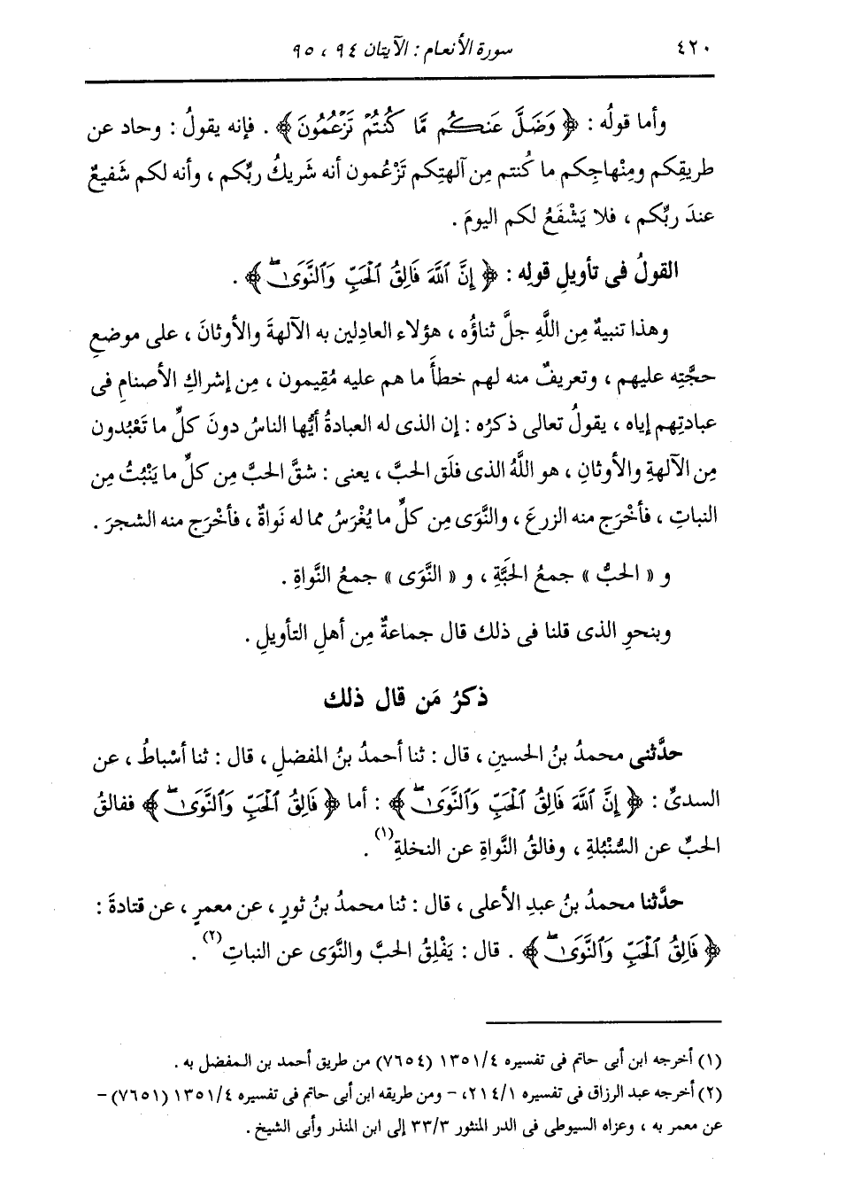 §الْقَوْلُ فِي تَأْوِيلِ قَوْلِهِ تَعَالَى: {إِنَّ اللَّهَ فَالِقُ الْحَبِّ وَالنَّوَى يُخْرِجُ الْحَيَّ مِنَ الْمَيِّتِ وَمُخْرِجُ الْمَيِّتِ مِنَ الْحَيِّ ذَلِكُمُ اللَّهُ فَأَنَّى تُؤْفَكُونَ} [الأنعام: 95] وَهَذَا تَنْبِيهٌ مِنَ اللَّهِ جَلَّ ثَنَاؤُهُ هَؤُلَاءِ الْعَادِلِينَ بِهِ الْآلِهَةَ وَالْأَوْثَانَ عَلَى مَوْضِعِ حُجَّتِهِ عَلَيْهِمْ، وَتَعْرِيفٌ مِنْهُ لَهُمْ خَطَأَ مَا هُمْ عَلَيْهِ مُقِيمُونَ مِنْ إِشْرَاكِ الْأَصْنَامِ فِي عِبَادَتِهِمْ إِيَّاهُ. يَقُولُ تَعَالَى ذِكْرُهُ: إِنَّ الَّذِي لَهُ الْعِبَادَةُ أَيُّهَا النَّاسُ دُونَ كُلِّ مَا تَعْبُدُونَ مِنَ الْآلِهَةِ وَالْأَوْثَانِ، هُوَ اللَّهُ الَّذِي فَلَقَ الْحَبَّ، يَعْنِي: شَقَّ الْحَبَّ مِنْ كُلِّ مَا يُنْبِتُ مِنَ النَّبَاتِ، فَأَخْرَجَ مِنْهُ الزَّرْعَ وَالنَّوَى مِنْ كُلِّ مَا يُغْرَسُ مِمَّا لَهُ نَوَاةٌ، فَأَخْرَجَ مِنْهُ الشَّجَرَ. وَالْحَبُّ جَمْعُ حَبَّةٍ، وَالنَّوَى: جَمْعُ النَّوَاةِ. وَبِنَحْوِ الَّذِي قُلْنَا فِي ذَلِكَ قَالَ جَمَاعَةٌ مِنْ أَهْلِ التَّأْوِيلِ