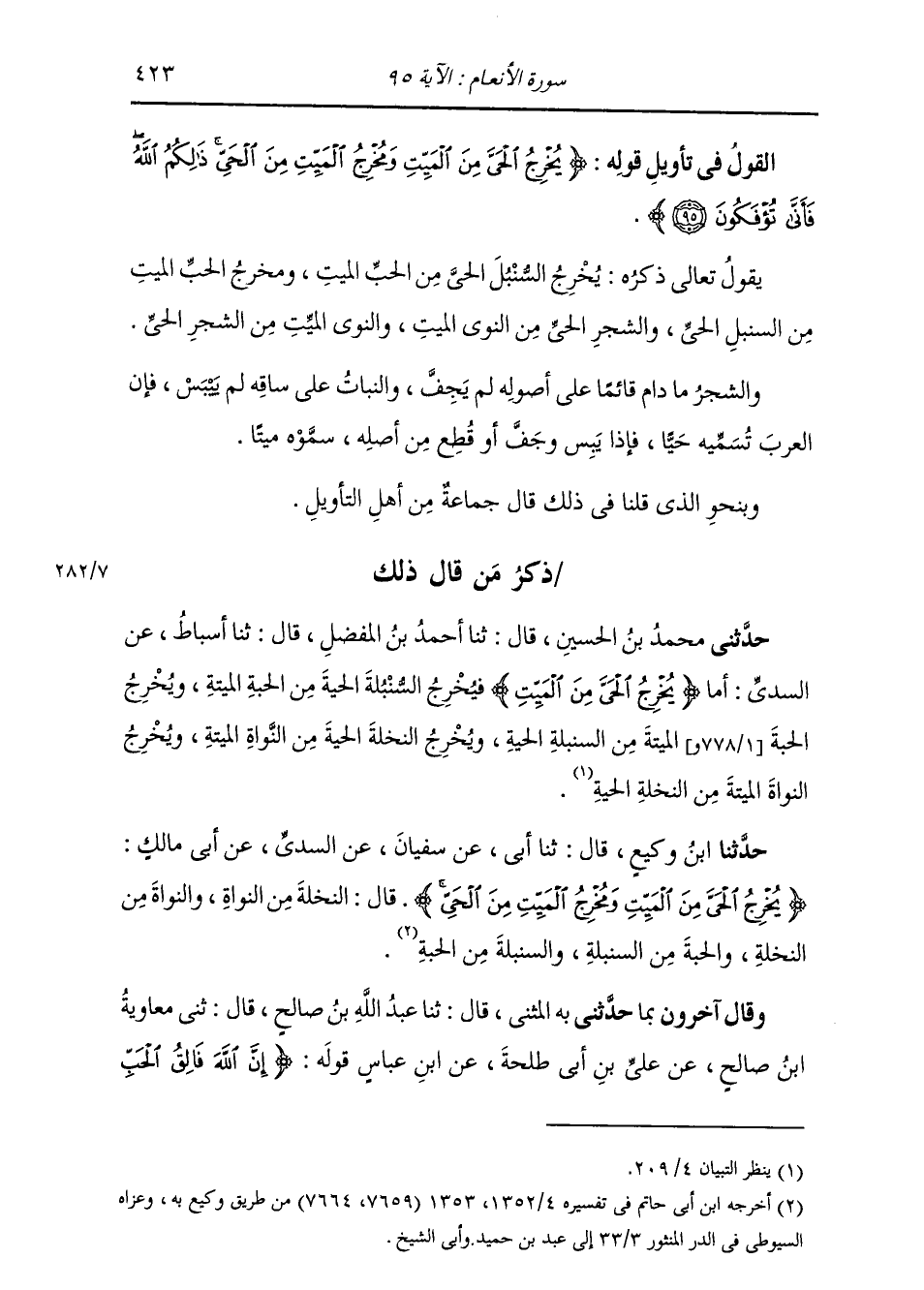 ذِكْرُ مَنْ قَالَ ذَلِكَ حَدَّثَنِي مُحَمَّدُ بْنُ الْحُسَيْنِ، قَالَ: ثنا أَحْمَدُ بْنُ الْمُفَضَّلِ، قَالَ: ثنا أَسْبَاطٌ، عَنِ السُّدِّيِّ: أَمَّا: {§يُخْرِجُ الْحَيَّ مِنَ الْمَيِّتِ} [الأنعام: 95] ، «فَيُخْرِجُ السُّنْبُلَةَ الْحَيَّةَ مِنَ الْحَبَّةِ الْمَيْتَةِ، وَيُخْرِجُ الْحَبَّةَ الْمَيْتَةَ مِنَ السُّنْبُلَةِ الْحَيَّةِ، وَيُخْرِجُ النَّخْلَةَ الْحَيَّةَ مِنَ النَّوَاةِ الْمَيْتَةِ، وَيُخْرِجُ النَّوَاةَ الْمَيْتَةَ مِنَ النَّخْلَةِ الْحَيَّةِ»