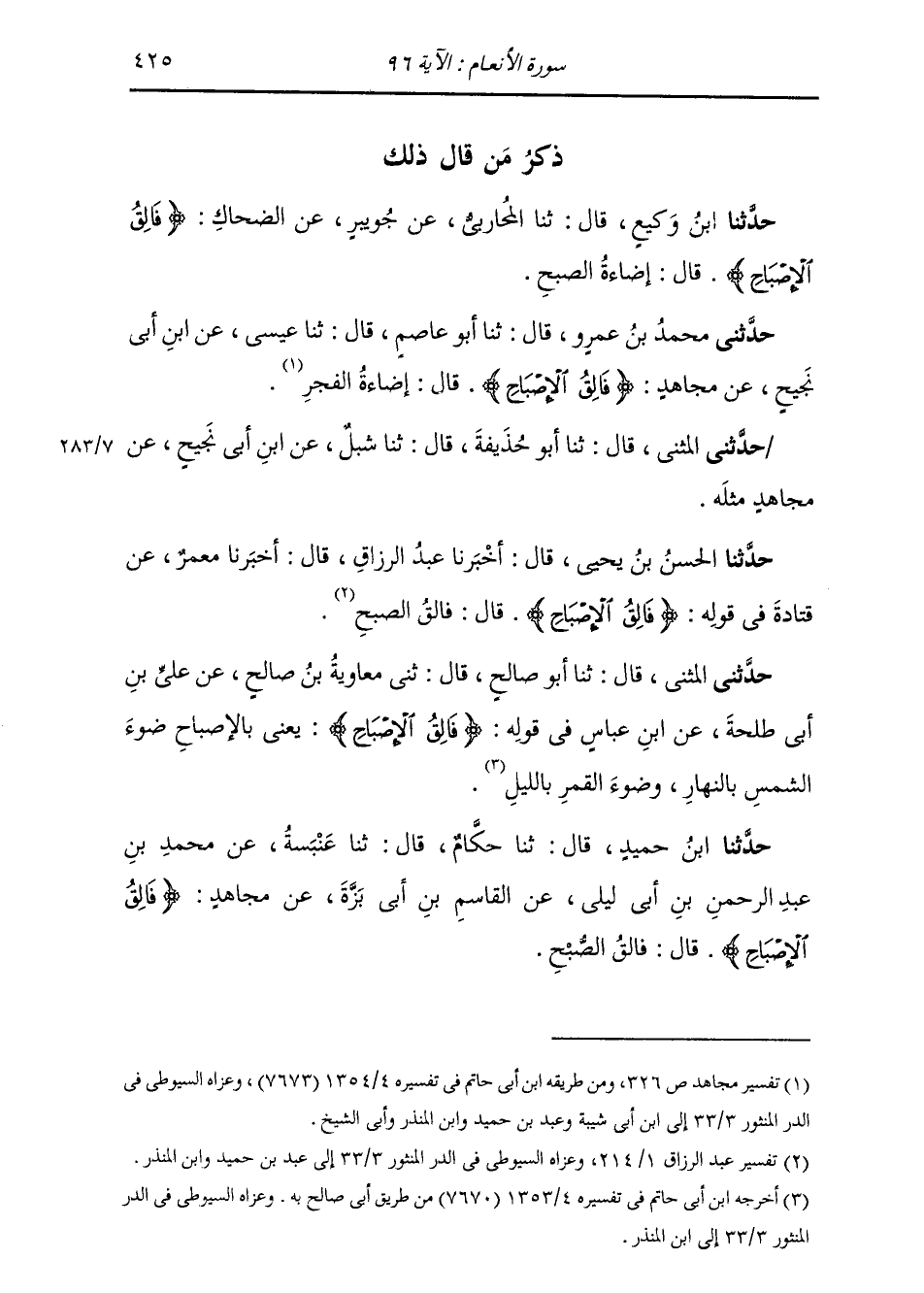 حَدَّثَنِي مُحَمَّدُ بْنُ عَمْرٍو، قَالَ: ثنا أَبُو عَاصِمٍ، قَالَ: ثنا عِيسَى، عَنِ ابْنِ أَبِي نَجِيحٍ، عَنْ مُجَاهِدٍ: {§فَالِقُ الْإِصْبَاحِ} [الأنعام: 96] قَالَ: «إِضَاءَةُ الْفَجْرِ» حَدَّثَنِي الْمُثَنَّى قَالَ: ثنا أَبُو حُذَيْفَةَ قَالَ: ثنا شِبْلٌ، عَنِ ابْنِ أَبِي نَجِيحٍ، عَنْ مُجَاهِدٍ، مِثْلَهُ