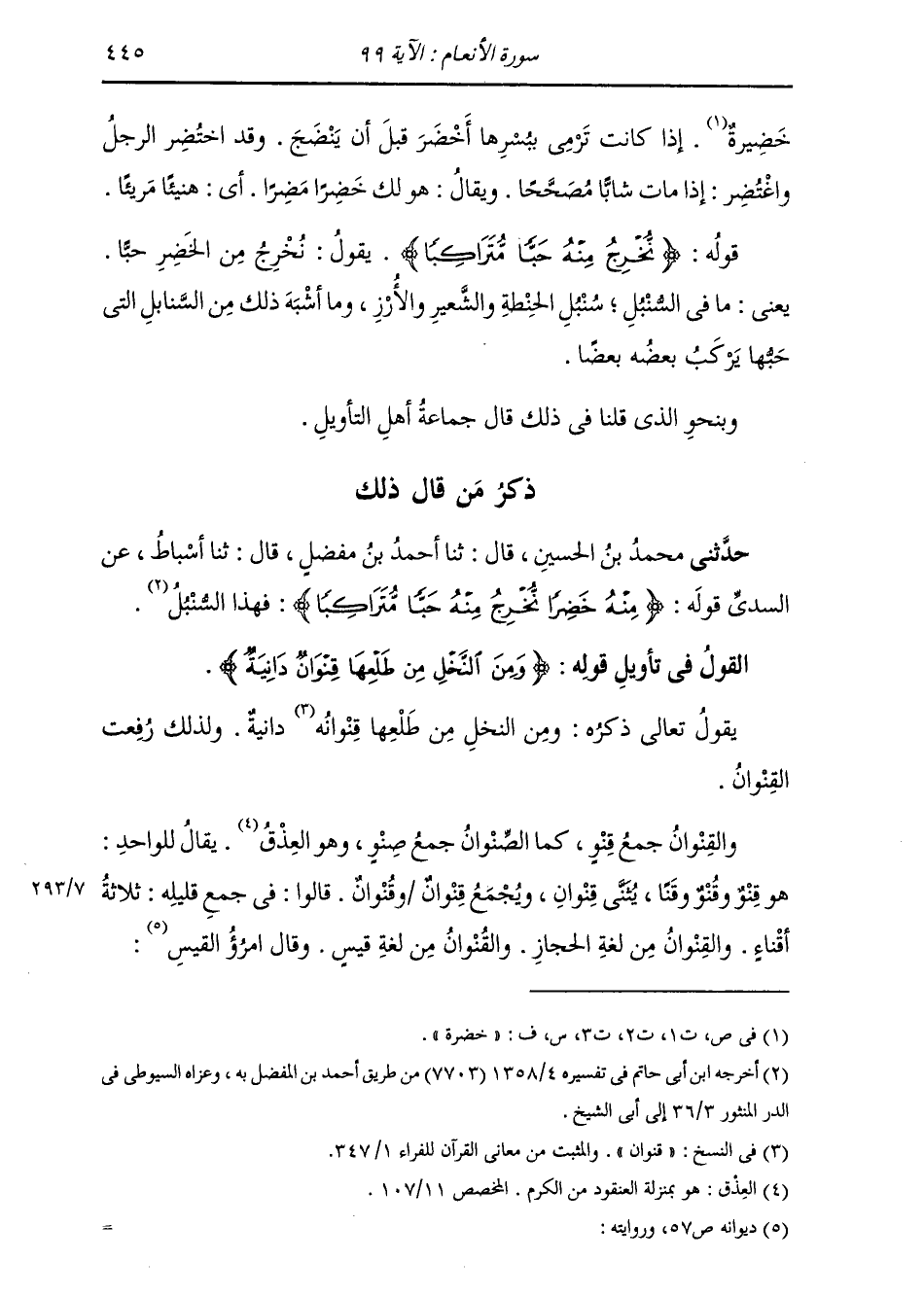 ذِكْرُ مَنْ قَالَ ذَلِكَ حَدَّثَنِي مُحَمَّدُ بْنُ الْحُسَيْنِ، قَالَ: ثنا أَحْمَدُ بْنُ مُفَضَّلٍ، قَالَ: ثنا أَسْبَاطٌ، عَنِ السُّدِّيِّ، قَوْلُهُ: {§مِنْهُ خَضِرًا نُخْرِجُ مِنْهُ حَبًّا مُتَرَاكِبًا} [الأنعام: 99] : «فَهَذَا السُّنْبُلُ»