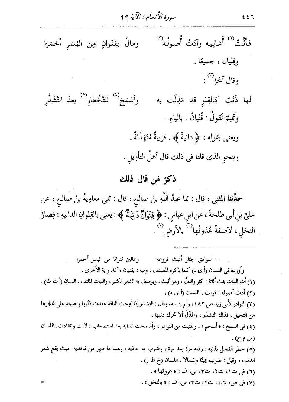ذِكْرُ مَنْ قَالَ ذَلِكَ حَدَّثَنَا الْمُثَنَّى، قَالَ: ثنا عَبْدُ اللَّهِ بْنُ صَالِحٍ، قَالَ: ثني مُعَاوِيَةُ بْنُ صَالِحٍ، عَنْ عَلِيِّ بْنِ أَبِي طَلْحَةَ، عَنِ ابْنِ عَبَّاسٍ: {§قِنْوَانٌ دَانِيَةٌ} [الأنعام: 99] : " يَعْنِي بِالْقِنْوَانِ الدَّانِيَةِ: قِصَارَ النَّخْلِ لَاصِقَةً عُذُوقَهَا بِالْأَرْضِ "