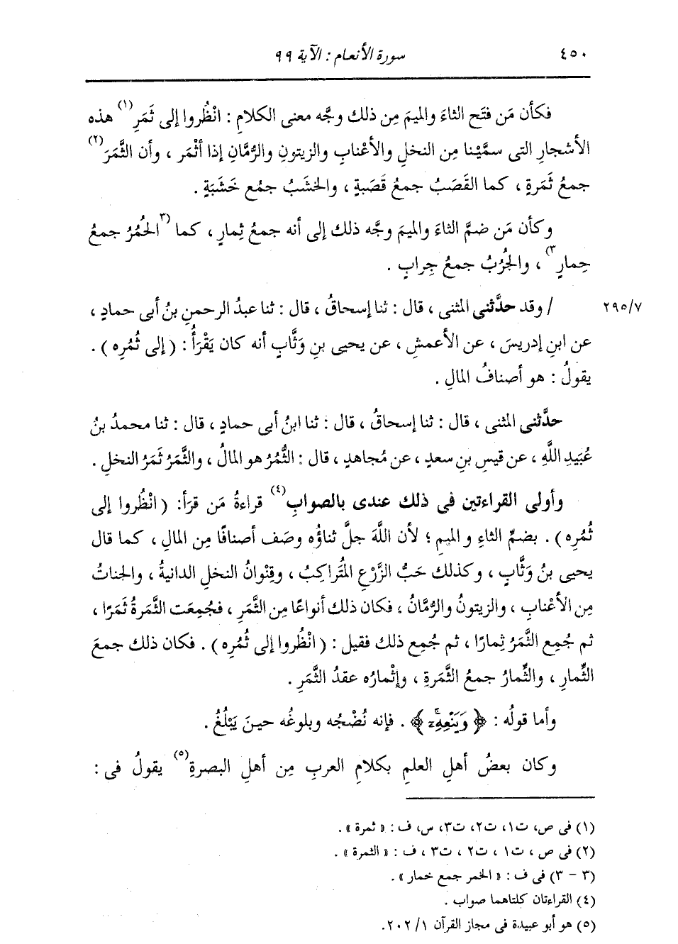 حَدَّثَنِي الْمُثَنَّى، قَالَ: ثنا إِسْحَاقُ، قَالَ: ثنا ابْنُ أَبِي حَمَّادٍ مُحَمَّدُ بْنُ عُبَيْدِ اللَّهِ، عَنْ قَيْسِ بْنِ سَعْدٍ، عَنْ مُجَاهِدٍ، قَالَ: " §الثُّمُرُ: هُوَ الْمَالُ، وَالثَّمَرُ: ثَمَرُ النَّخْلِ " وَأَوْلَى الْقِرَاءَتَيْنِ فِي ذَلِكَ عِنْدِي بِالصَّوَابِ، قِرَاءَةُ مَنْ قَرَأَ: {انْظُرُوا إِلَى ثُمُرِهِ} [الأنعام: 99] بِضَمِّ الثَّاءِ وَالْمِيمِ، لِأَنَّ اللَّهَ جَلَّ ثَنَاؤُهُ وَصَفَ أَصْنَافًا مِنَ الْمَالِ، كَمَا قَالَ يَحْيَى بْنُ وَثَّابٍ، وَكَذَلِكَ حَبَّ الزَّرْعِ الْمُتَرَاكِبَ، وَقِنْوَانَ النَّخْلِ الدَّانِيَةَ، وَالْجَنَّاتِ مِنَ الْأَعْنَابِ وَالزَّيْتُونِ وَالرُّمَّانِ، فَكَانَ ذَلِكَ أَنْوَاعًا مِنَ الثَّمَرِ، فَجُمِعَتِ الثَّمَرَةُ ثَمَرًا، ثُمَّ جُمِعَ الثَّمَرُ ثِمَارًا، ثُمَّ جُمِعَ ذَلِكَ فَقِيلَ: (انْظُرُوا إِلَى ثُمُرِهِ) ، فَكَانَ ذَلِكَ جَمْعَ الثِّمَارِ، وَالثِّمَارُ جَمْعَ الثَّمَرَةِ، وَإِثْمَارُهُ: عَقْدُ الثَّمَرِ