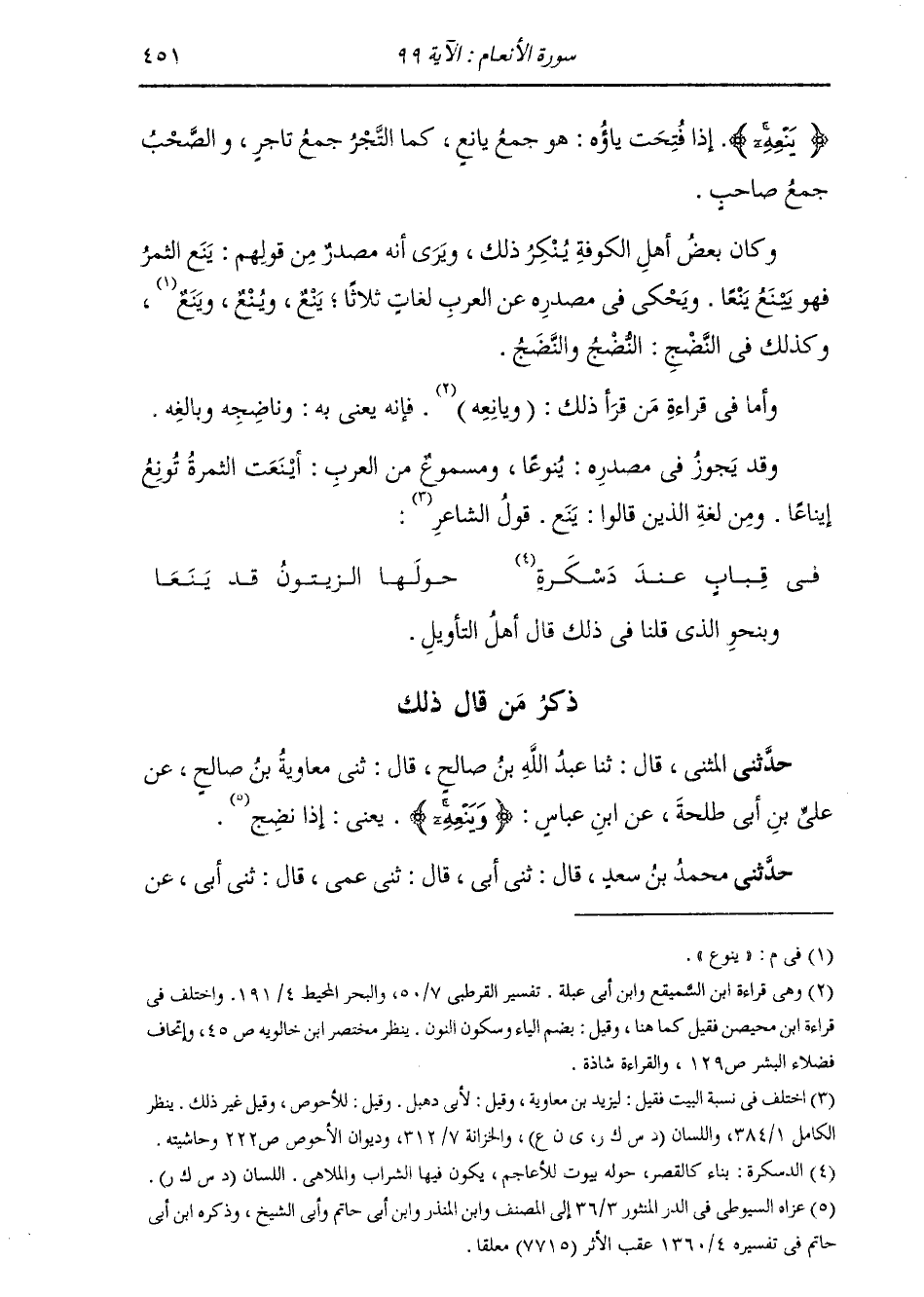 ذِكْرُ مَنْ قَالَ ذَلِكَ حَدَّثَنِي الْمُثَنَّى، قَالَ: ثنا عَبْدُ اللَّهِ بْنُ صَالِحٍ، قَالَ: ثني مُعَاوِيَةُ بْنُ صَالِحٍ، عَنْ عَلِيِّ بْنِ أَبِي طَلْحَةَ، عَنِ ابْنِ عَبَّاسٍ: {§وَيَنْعِهِ} [الأنعام: 99] يَعْنِي: «إِذَا نَضَجَ»