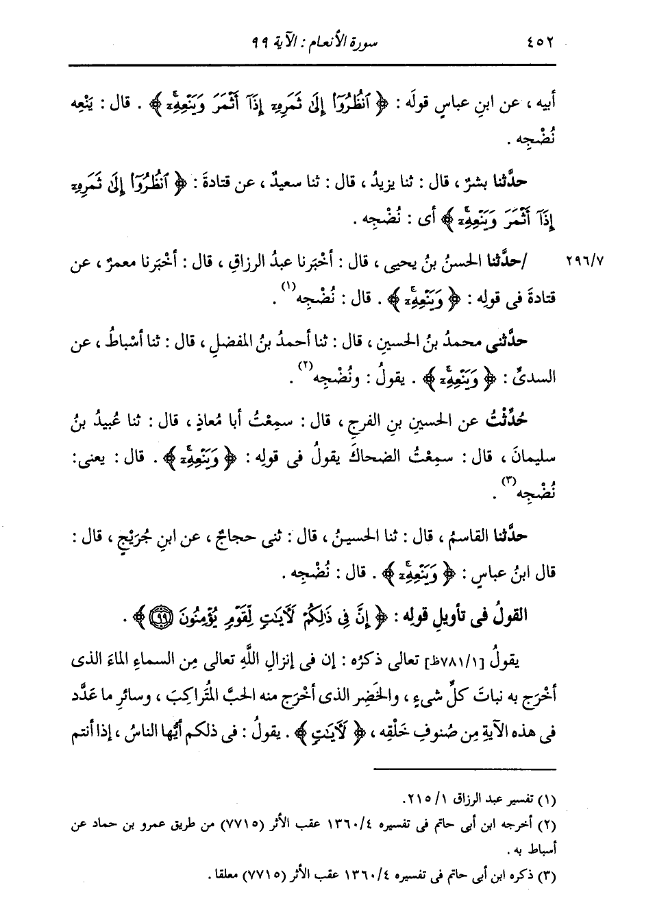 حَدَّثَنَا الْقَاسِمُ قَالَ: ثنا الْحُسَيْنُ قَالَ: ثني حَجَّاجٌ، عَنِ ابْنِ جُرَيْجٍ قَالَ: قَالَ ابْنُ عَبَّاسٍ: {§وَيَنْعِهِ} [الأنعام: 99] قَالَ: «نُضْجُهُ»