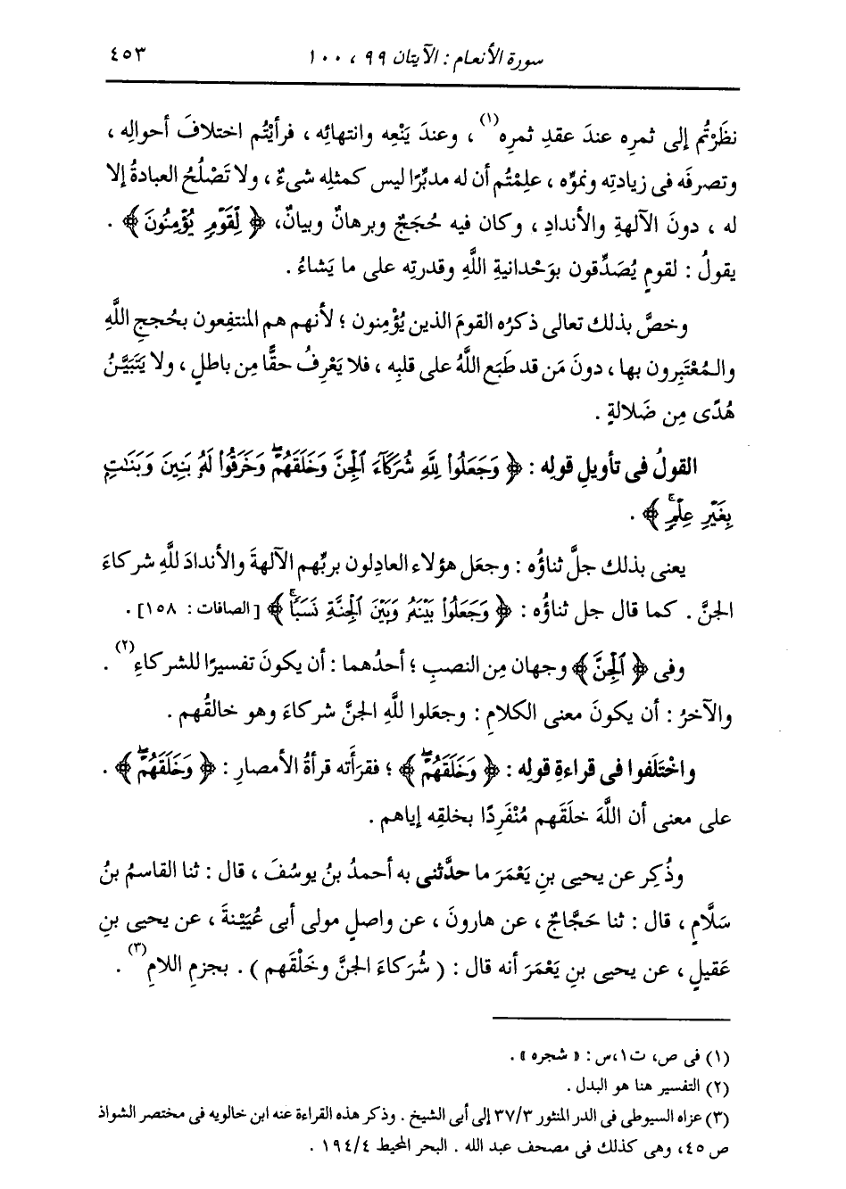 حَدَّثَنِي بِهِ، أَحْمَدُ بْنُ يُوسُفَ قَالَ: ثنا الْقَاسِمُ بْنُ سَلَّامٍ، قَالَ: ثنا حَجَّاجٌ، عَنْ هَارُونَ، عَنْ وَاصِلٍ، مَوْلَى أَبِي عُيَيْنَةَ، عَنْ يَحْيَى بْنِ عَقِيلٍ، عَنْ يَحْيَى بْنِ يَعْمُرٍ، أَنَّهُ قَالَ: (§شُرَكَاءَ الْجِنَّ وَخَلْقَهُمْ) بِجَزْمِ اللَّامِ -[454]- بِمَعْنَى أَنَّهُمْ قَالُوا: إِنَّ الْجِنَّ شُرَكَاءُ لِلَّهِ فِي خَلْقِهِ إِيَّانَا وَأَوْلَى الْقِرَاءَتَيْنِ بِالصَّوَابِ قِرَاءَةُ مَنْ قَرَأَ ذَلِكَ: {وَخَلَقَهُمْ} [الأنعام: 100] ، لِإِجْمَاعِ الْحُجَّةِ مِنَ الْقُرَّاءِ عَلَيْهَا