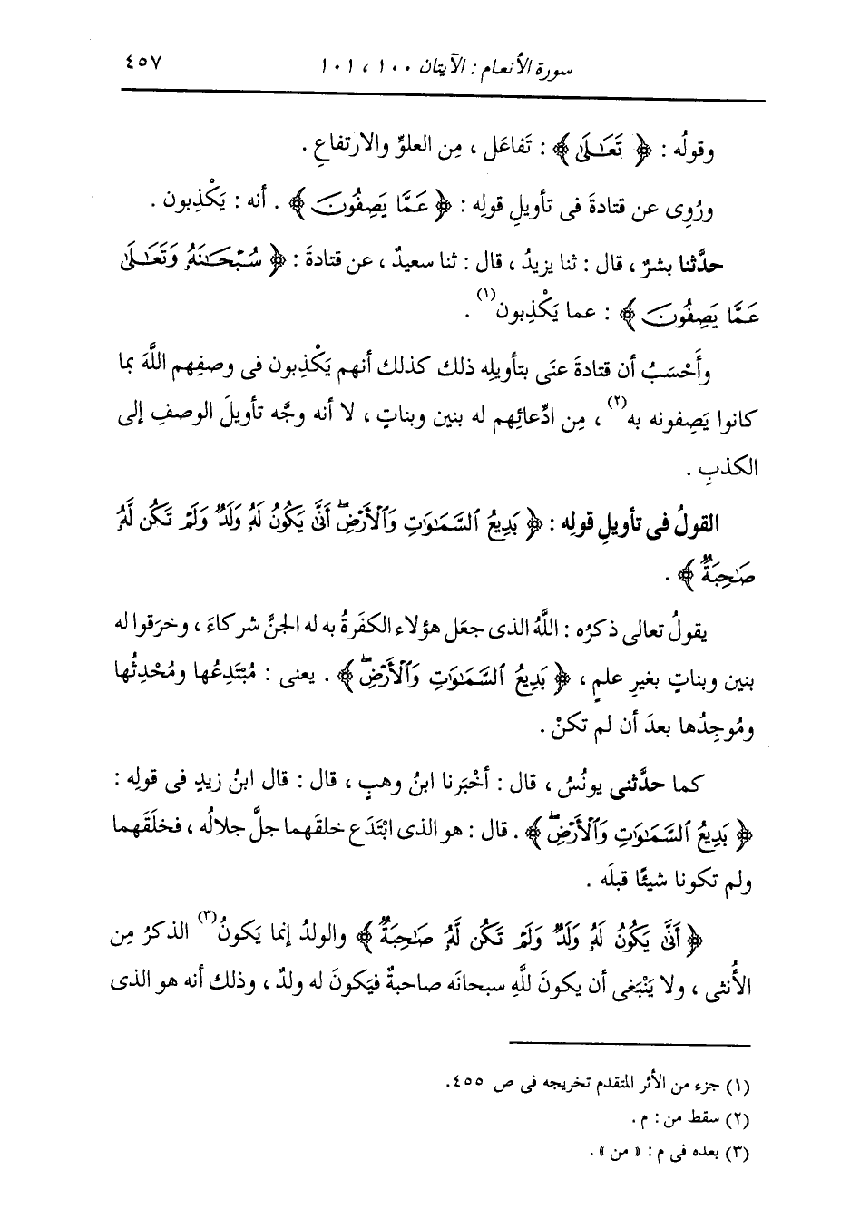 حَدَّثَنَا بِشْرٌ، قَالَ: ثنا يَزِيدُ، قَالَ: ثنا سَعِيدٌ، عَنْ قَتَادَةَ: {§سُبْحَانَهُ وَتَعَالَى عَمَّا يَصِفُونَ} [الأنعام: 100] : «عَمَّا يَكْذِبُونَ» وَأَحْسَبُ أَنَّ قَتَادَةَ عَنَى بِتَأْوِيلِهِ ذَلِكَ كَذَلِكَ، أَنَّهُمْ يَكْذِبُونَ فِي وَصْفِهِمُ اللَّهَ بِمَا كَانُوا يَصِفُونَهُ مِنِ ادِّعَائِهِمْ لَهُ بَنِينَ وَبَنَاتٍ، لَا أَنَّهُ وَجَّهَ تَأْوِيلَ الْوَصْفِ إِلَى الْكَذِبِ