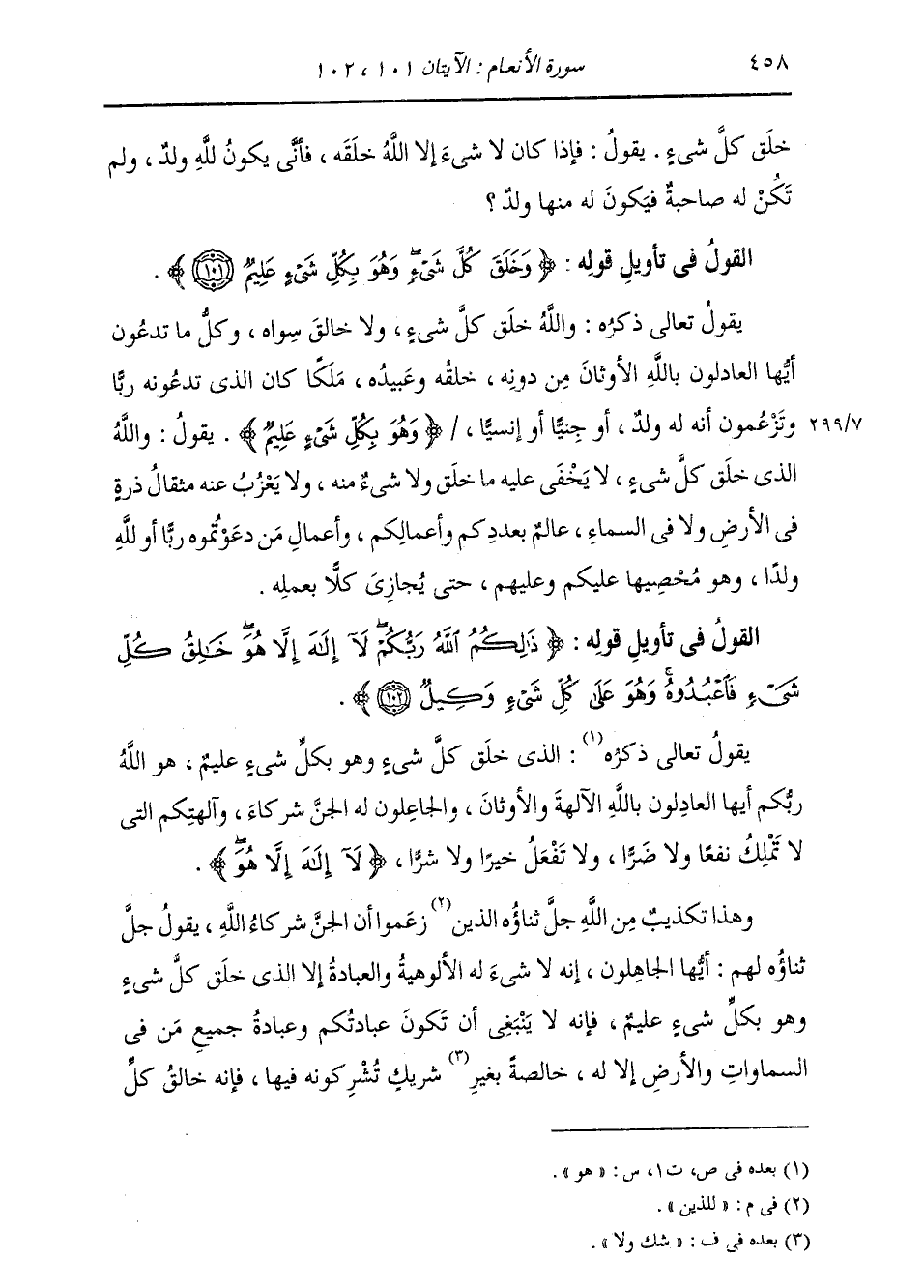 §الْقَوْلُ فِي تَأْوِيلِ قَوْلِهِ تَعَالَى: {ذَلِكُمُ اللَّهُ رَبُّكُمْ لَا إِلَهَ إِلَّا هُوَ خَالِقُ كُلِّ شَيْءٍ فَاعْبُدُوهُ وَهُوَ عَلَى كُلِّ شَيْءٍ وَكِيلٌ} [الأنعام: 102] يَقُولُ تَعَالَى ذِكْرُهُ: الَّذِي خَلَقَ كُلَّ شَيْءٍ وَهُوَ بِكُلِّ شَيْءٍ عَلِيمٌ، هُوَ اللَّهُ رَبُّكُمْ أَيُّهَا الْعَادِلُونَ بِاللَّهِ الْآلِهَةَ وَالْأَوْثَانَ، وَالْجَاعِلُونَ لَهُ الْجِنَّ شُرَكَاءَ، وَآلِهَتَكُمُ الَّتِي لَا تَمْلِكُ نَفْعًا وَلَا ضَرًّا، وَلَا تَفْعَلُ خَيْرًا وَلَا شَرًّا. {لَا إِلَهَ إِلَّا هُوَ} [البقرة: 163] : وَهَذَا تَكْذِيبٌ مِنَ اللَّهِ جَلَّ ثَنَاؤُهُ لِلَّذِينَ زَعَمُوا أَنَّ الْجِنَّ شُرَكَاءُ اللَّهِ، يَقُولُ جَلَّ ثَنَاؤُهُ لَهُمْ: أَيُّهَا الْجَاهِلُونُ، إِنَّهُ لَا شَيْءَ لَهُ الْأُلُوهِيَّةُ وَالْعِبَادَةُ إِلَّا الَّذِي خَلَقَ كُلَّ شَيْءٍ، وَهُوَ بِكُلِّ شَيْءٍ عَلِيمٌ، فَإِنَّهُ لَا يَنْبَغِي أَنْ تَكُونَ عِبَادَتُكُمْ وَعِبَادَةُ جَمِيعِ مَنْ فِي السَّمَوَاتِ وَالْأَرْضِ إِلَّا لَهُ خَالِصَةً بِغَيْرِ شَرِيكٍ تُشْرِكُونَهُ فِيهَا، فَإِنَّهُ خَالِقُ كُلِّ