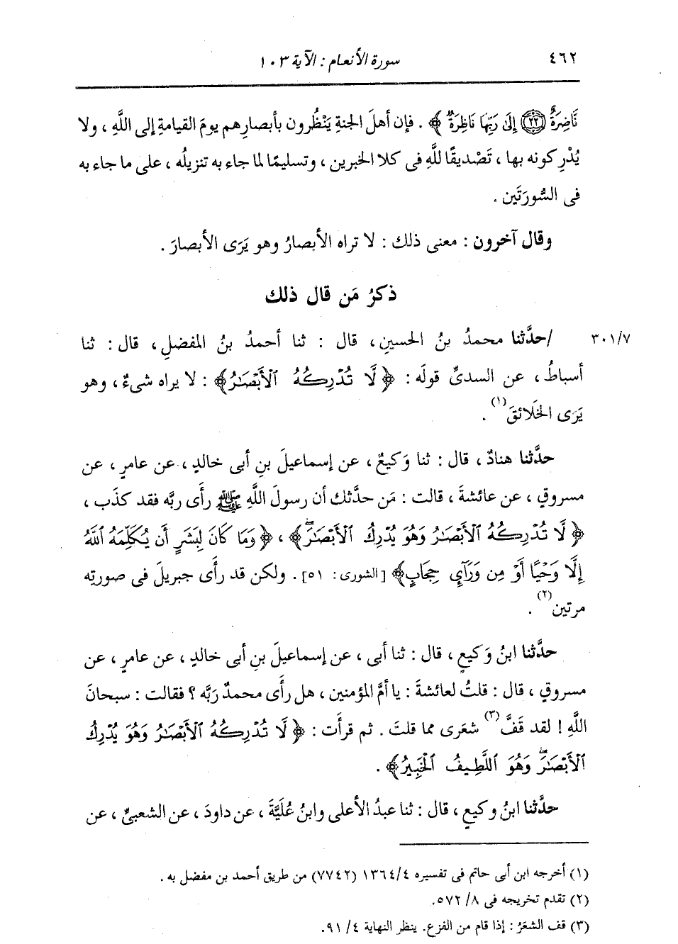 حَدَّثَنَا هَنَّادٌ، قَالَ: ثنا وَكِيعٌ، عَنْ إِسْمَاعِيلَ بْنِ أَبِي خَالِدٍ، عَنْ عَامِرٍ، عَنْ مَسْرُوقٍ، عَنْ عَائِشَةَ، قَالَتْ: مَنْ حَدَّثَكَ أَنَّ رَسُولَ اللَّهِ صَلَّى اللهُ عَلَيْهِ وَسَلَّمَ رَأَى رَبَّهُ فَقَدْ كَذَبَ، {لَا تُدْرِكُهُ الْأَبْصَارُ وَهُوَ يُدْرِكُ الْأَبْصَارَ} [الأنعام: 103] ، {وَمَا كَانَ لِبَشَرٍ أَنْ يُكَلِّمَهُ اللَّهُ إِلَّا وَحْيًا أَوْ مِنْ وَرَاءِ حِجَابٍ} [الشورى: 51] ، وَلَكِنْ §قَدْ رَأَى جِبْرِيلَ فِي صُورَتِهِ مَرَّتَيْنِ