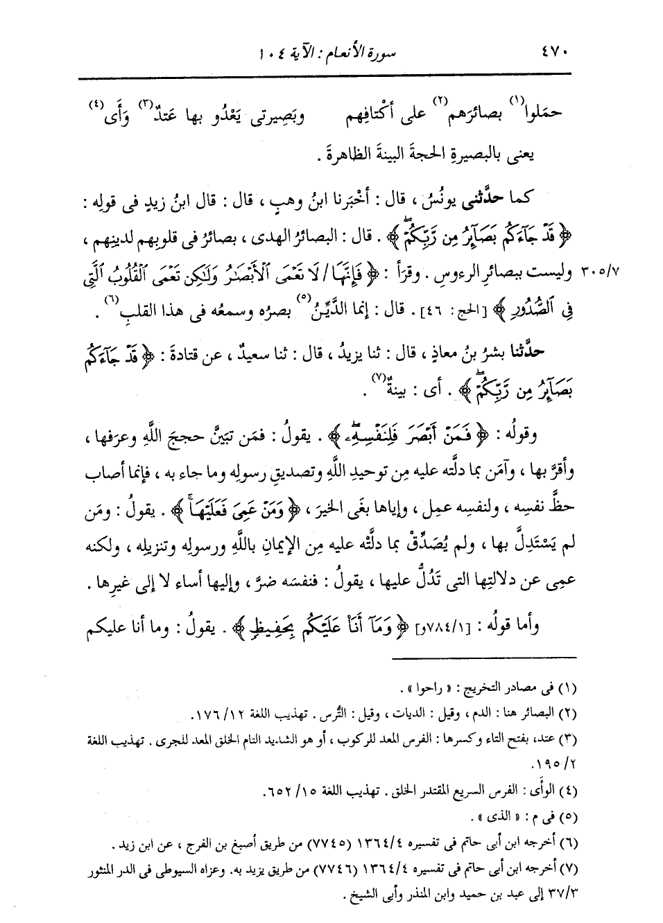 كَمَا حَدَّثَنِي يُونُسُ، قَالَ: أَخْبَرَنَا ابْنُ وَهْبٍ، قَالَ: قَالَ ابْنُ زَيْدٍ، فِي قَوْلِهِ: {§قَدْ جَاءَكُمْ بَصَائِرُ مِنْ رَبِّكُمْ} [الأنعام: 104] قَالَ: " الْبَصَائِرُ: الْهُدَى، بَصَائِرُ فِي قُلُوبِهِمْ لِدِينِهِمْ، وَلَيْسَتْ بِبَصَائِرِ الرُّءُوسِ. وَقَرَأَ: {فَإِنَّهَا لَا تَعْمَى الْأَبْصَارُ وَلَكِنْ تَعْمَى الْقُلُوبُ الَّتِي فِي الصُّدُورِ} [الحج: 46] ، قَالَ: إِنَّمَا الدِّينُ بَصَرُهُ وَسَمْعُهُ فِي هَذَا الْقَلْبِ "
