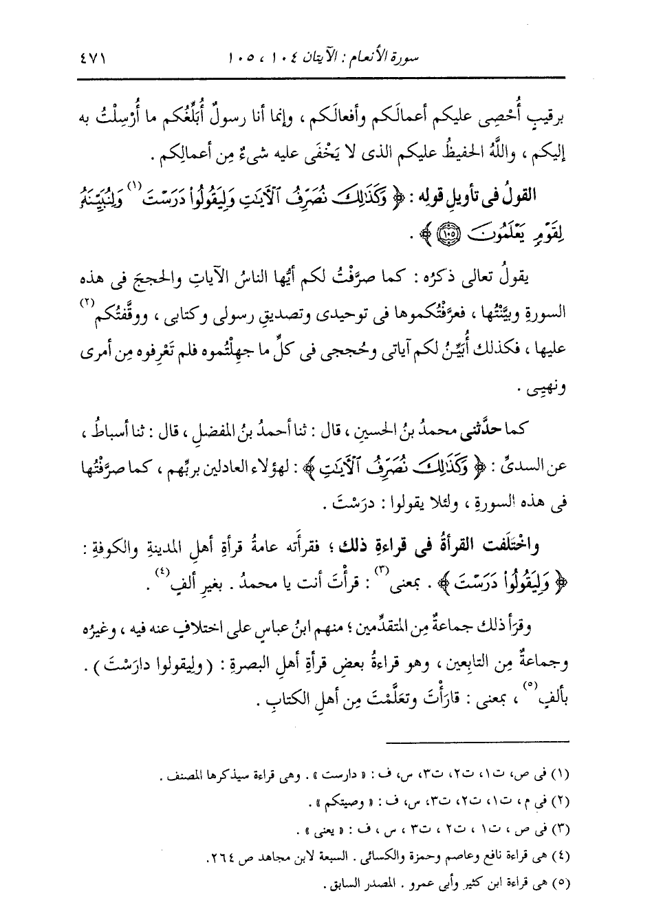 كَمَا حَدَّثَنِي مُحَمَّدُ بْنُ الْحُسَيْنِ، قَالَ: ثنا أَحْمَدُ بْنُ الْمُفَضَّلِ، قَالَ: ثنا أَسْبَاطٌ، عَنِ السُّدِّيِّ: {§وَكَذَلِكَ نُصَرِّفُ الْآيَاتِ} [الأنعام: 105] " لِهَؤُلَاءِ الْعَادِلِينَ بِرَبِّهِمْ، كَمَا صَرَّفْتُهَا فِي هَذِهِ السُّورَةِ، وَلِئَلَّا يَقُولُوا: دَرَسْتَ " وَاخْتَلَفَتِ الْقُرَّاءُ فِي قِرَاءَةِ ذَلِكَ، فَقَرَأَتْهُ عَامَّةُ قُرَّاءِ أَهْلِ الْمَدِينَةِ وَالْكُوفَةِ: {وَلِيَقُولُوا دَرَسْتَ} [الأنعام: 105] ، يَعْنِي قَرَأْتَ أَنْتَ يَا مُحَمَّدُ، بِغَيْرِ أَلِفٍ. وَقَرَأَ ذَلِكَ جَمَاعَةٌ مِنَ الْمُتَقَدِّمِينَ مِنْهُمُ ابْنُ عَبَّاسٍ عَلَى اخْتِلَافٍ عَنْهُ فِيهِ، وَغَيْرُهُ وَجَمَاعَةٌ مِنَ التَّابِعِينَ، وَهُوَ قِرَاءَةُ بَعْضِ قُرَّاءِ أَهْلِ الْبَصْرَةِ: (وَلِيَقُولُوا دَارَسْتَ) بِأَلِفٍ، بِمَعْنَى: قَارَأْتَ وَتَعَلَّمْتَ مِنْ أَهْلِ الْكِتَابِ.