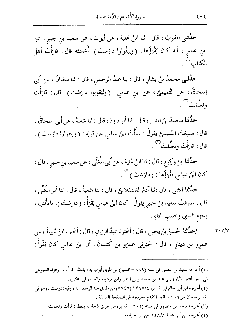 حَدَّثَنَا الْمُثَنَّى قَالَ: ثنا آدَمُ الْعَسْقَلَانِيُّ قَالَ: ثنا شُعْبَةُ قَالَ: ثنا أَبُو الْمُعَلَّى قَالَ: سَمِعْتُ سَعِيدَ بْنَ جُبَيْرٍ يَقُولُ: كَانَ ابْنُ عَبَّاسٍ يَقْرَأُ: (§دَارَسْتَ) بِالْأَلِفِ، بِجَزْمِ السِّينِ وَنَصْبِ التَّاءِ