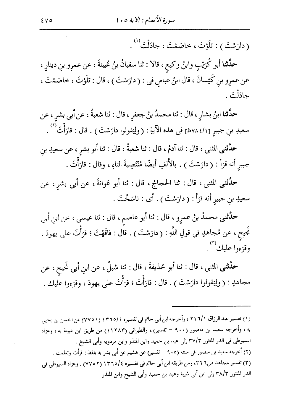 حَدَّثَنِي الْمُثَنَّى قَالَ: ثنا الْحَجَّاجُ قَالَ: ثنا أَبُو عَوَانَةَ، عَنْ أَبِي بِشْرٍ، عَنْ سَعِيدِ بْنِ جُبَيْرٍ أَنَّهُ §قَرَأَ: (دَارَسْتَ) : أَيْ «نَاسَخْتَ»