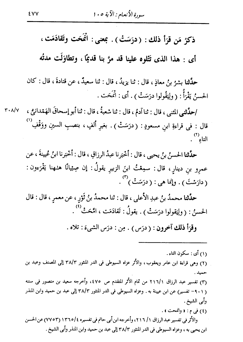 حَدَّثَنِي الْمُثَنَّى، قَالَ: ثنا آدَمُ، قَالَ: ثنا شُعْبَةُ، قَالَ: ثنا أَبُو إِسْحَاقَ الْهَمْدَانِيُّ، قَالَ فِي قِرَاءَةِ ابْنِ مَسْعُودٍ: (§دَرَسَتْ) بِغَيْرِ أَلِفٍ، بِنَصْبِ السِّينِ وَوَقْفِ التَّاءِ