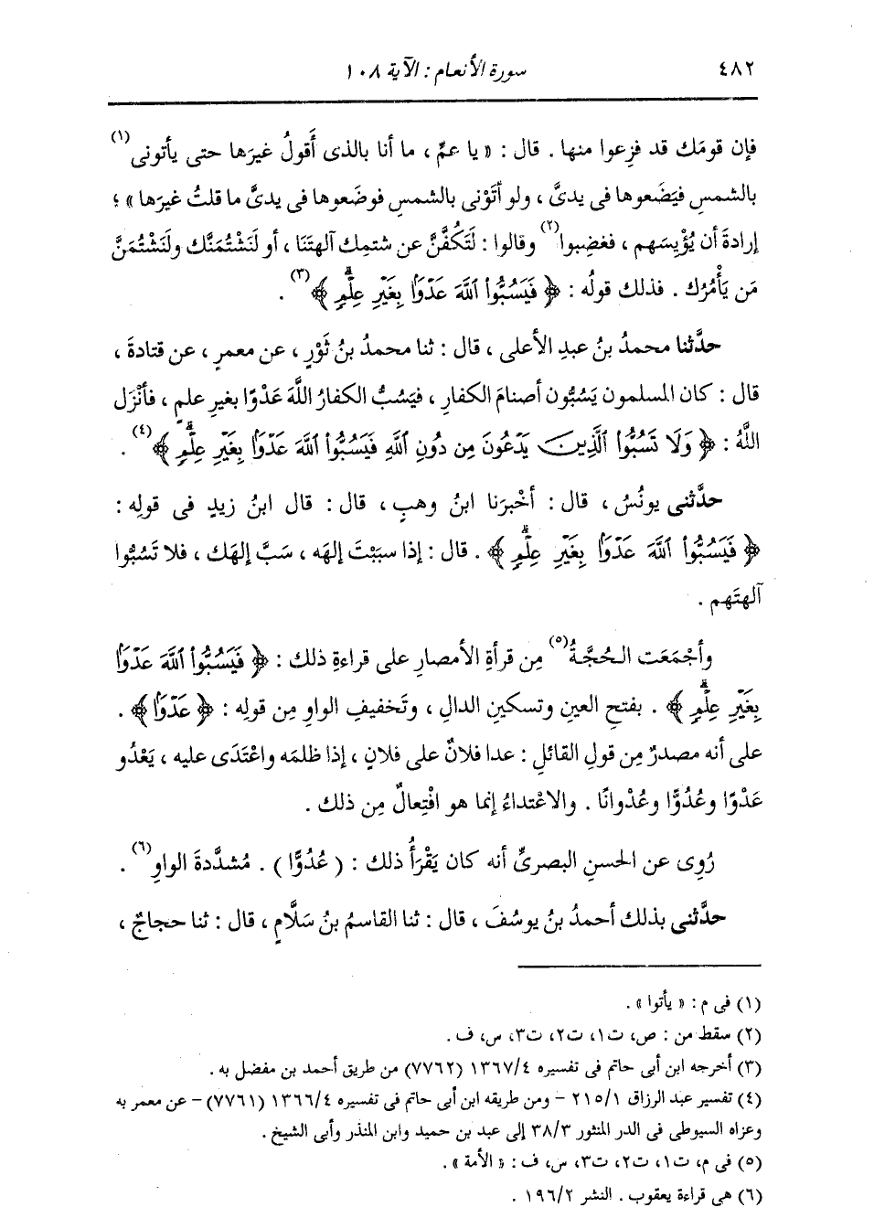 حَدَّثَنِي يُونُسُ، قَالَ: أَخْبَرَنَا ابْنُ وَهْبٍ، قَالَ: قَالَ ابْنُ زَيْدٍ، فِي قَوْلِهِ: {§فَيَسُبُّوا اللَّهَ عَدْوًا بِغَيْرِ عِلْمٍ} [الأنعام: 108] قَالَ: «إِذَا سَبَبْتَ إِلَهَهُ سَبَّ إِلَهَكَ، فَلَا تَسُبُّوا آلِهَتَهُمْ» وَأَجْمَعَتِ الْحُجَّةُ مِنْ قُرَّاءِ الْأَمْصَارِ عَلَى قِرَاءَةِ ذَلِكَ: {فَيَسُبُّوا اللَّهَ عَدْوًا بِغَيْرِ عِلْمٍ} [الأنعام: 108] ، بِفَتْحِ الْعَيْنِ وَتَسْكِينِ الدَّالِ وَتَخْفِيفِ الْوَاوِ مِنْ قَوْلِهِ: {عَدْوًا} [البقرة: 97] ، عَلَى أَنَّهُ مَصْدَرٌ مِنْ قَوْلِ الْقَائِلِ: عَدَا فُلَانٌ عَلَى فُلَانٍ: إِذَا ظَلَمَهُ وَاعْتَدَى عَلَيْهِ، يَعْدُو عَدْوًا وَعُدْوَانًا، وَالِاعْتِدَاءُ: إِنَّمَا هُوَ افْتِعَالٌ مِنْ ذَلِكَ. رُوِيَ عَنِ الْحَسَنِ الْبَصْرِيِّ أَنَّهُ كَانَ يَقْرَأُ ذَلِكَ: (عَدُوًّا) مُشَدَّدَةَ الْوَاوِ