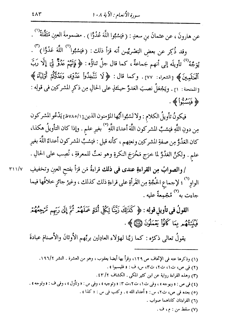 عَنْ هَارُونَ، عَنْ عُثْمَانَ بْنِ سَعْدٍ: (§فَيَسُبُّوا اللَّهَ عُدُوًّا) مَضْمُومَةُ الْعَيْنِ مُثَقَّلَةٌ " وَقَدْ ذُكِرَ عَنْ بَعْضِ الْبَصْرِيِّينَ أَنَّهُ قَرَأَ ذَلِكَ: (فَيَسُبُّوا اللَّهَ عَدُوًّا) يُوَجِّهُ تَأْوِيلَهُ إِلَى أَنَّهُمْ جَمَاعَةٌ، كَمَا قَالَ جَلَّ ثَنَاؤُهُ: {فَإِنَّهُمْ عَدُوٌّ لِي إِلَّا رَبَّ الْعَالَمِينَ} [الشعراء: 77] ، وَكَمَا قَالَ: {لَا تَتَّخِذُوا عَدُوِّي وَعَدُوَّكُمْ أَوْلِيَاءَ} [الممتحنة: 1] ، وَيَجْعَلُ نَصْبَ (الْعَدُوَّ) حِينَئِذٍ عَلَى الْحَالِ مِنْ ذِكْرِ الْمُشْرِكِينَ فِي قَوْلِهِ: {فَيَسُبُّوا} [الأنعام: 108] ، فَيَكُونُ تَأْوِيلُ الْكَلَامِ: وَلَا تَسُبُّوا أَيُّهَا الْمُؤْمِنُونَ الَّذِينَ يَدْعُو الْمُشْرِكُونَ مِنْ دُونِ اللَّهِ، فَيَسُبُّ الْمُشْرِكُونَ اللَّهَ أَعْدَاءُ اللَّهِ بِغَيْرِ عِلْمٍ. وَإِذَا كَانَ التَّأْوِيلُ هَكَذَا كَانَ الْعَدُوُّ مِنْ صِفَةِ الْمُشْرِكِينَ وَنَعْتِهِمْ، كَأَنَّهُ قِيلَ: فَيَسُبُّ الْمُشْرِكُونَ أَعْدَاءُ اللَّهِ بِغَيْرِ عِلْمٍ، وَلَكِنَّ الْعَدُوَّ لَمَّا خَرَجَ مَخْرَجَ النَّكِرَةَ وَهُوَ نَعْتٌ لِلْمَعْرِفَةِ نُصِبَ عَلَى الْحَالِ. وَالصَّوَابُ مِنَ الْقِرَاءَةِ عِنْدِي فِي ذَلِكَ قِرَاءَةُ مَنْ قَرَأَ بِفَتْحِ الْعَيْنِ وَتَخْفِيفِ الْوَاوِ لِإِجْمَاعِ الْحُجَّةِ مِنَ الْقُرَّاءِ عَلَى قِرَاءَةِ ذَلِكَ كَذَلِكَ، وَغَيْرُ جَائِزٍ خِلَافُهَا فِيمَا جَاءَتْ مُجْمِعَةً عَلَيْهِ