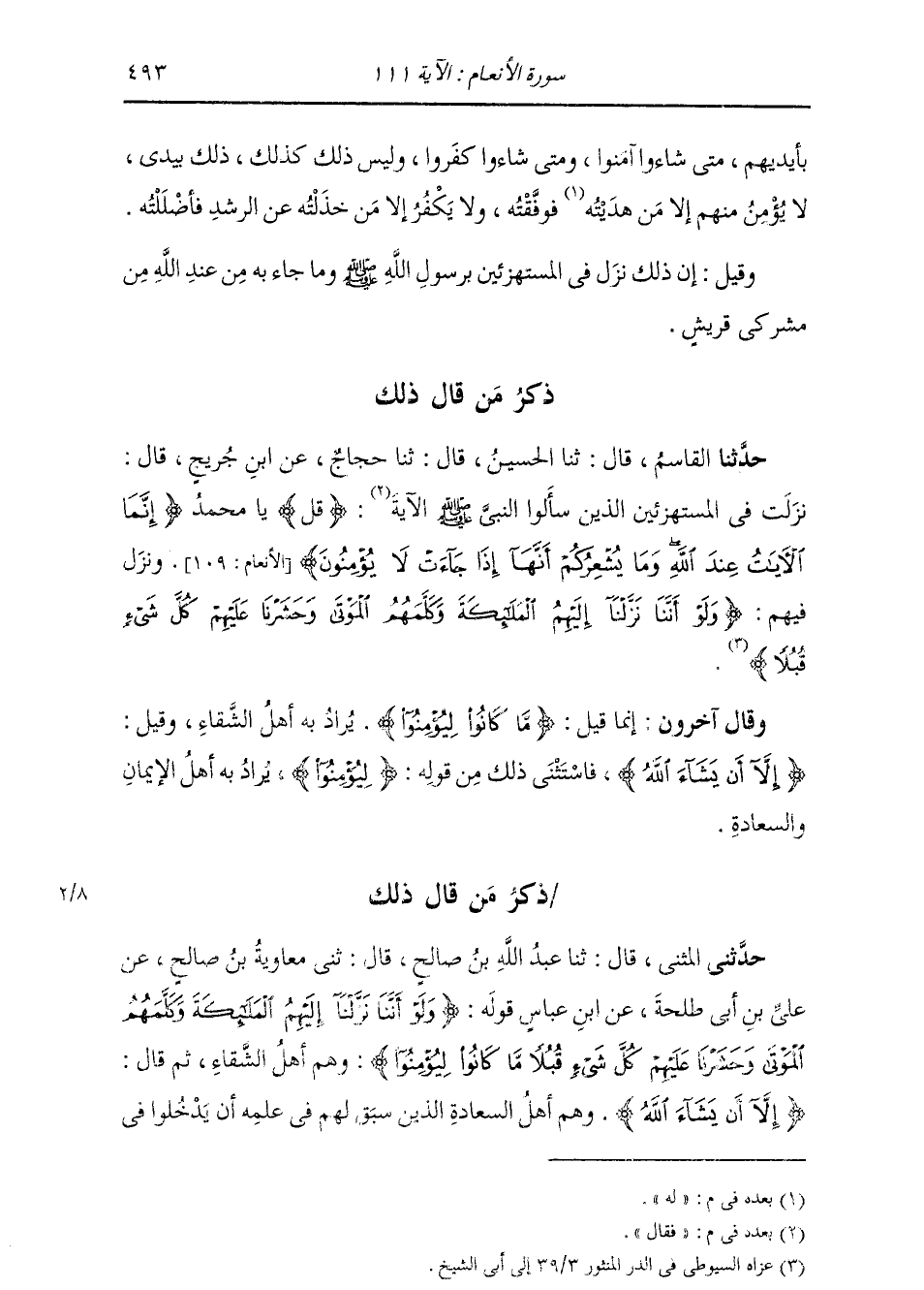 ذِكْرُ مَنْ قَالَ ذَلِكَ حَدَّثَنَا الْقَاسِمُ، قَالَ: ثنا الْحُسَيْنُ، قَالَ: ثنا حَجَّاجٌ، عَنِ ابْنِ جُرَيْجٍ، قَالَ: " §نَزَلَتْ فِي الْمُسْتَهْزِئِينَ الَّذِينَ سَأَلُوا النَّبِيَّ صَلَّى اللهُ عَلَيْهِ وَسَلَّمَ الْآيَةَ، فَقَالَ: قُلْ يَا مُحَمَّدُ: إِنَّمَا الْآيَاتُ عِنْدَ اللَّهِ، وَمَا يُشْعِرُكُمْ أَنَّهَا إِذَا جَاءَتْ لَا يُؤْمِنُونَ. وَنَزَلَ فِيهِمْ: {وَلَوْ أَنَّنَا نَزَّلْنَا إِلَيْهِمُ الْمَلَائِكَةَ وَكَلَّمَهُمُ الْمَوْتَى وَحَشَرْنَا عَلَيْهِمْ كُلَّ شَيْءٍ قُبُلًا} [الأنعام: 111] وَقَالَ آخَرُونَ: إِنَّمَا قِيلَ: {مَا كَانُوا لِيُؤْمِنُوا} [الأنعام: 111] يُرَادُ بِهِ أَهْلَ الشَّقَاءِ، وَقِيلَ: {إِلَّا أَنْ يَشَاءَ اللَّهُ} [الأنعام: 111] فَاسْتَثْنَى ذَلِكَ مِنْ قَوْلِهِ: {لِيُؤْمِنُوا} [الأنعام: 111] ، يُرَادُ بِهِ أَهْلُ الْإِيمَانِ وَالسَّعَادَةِ